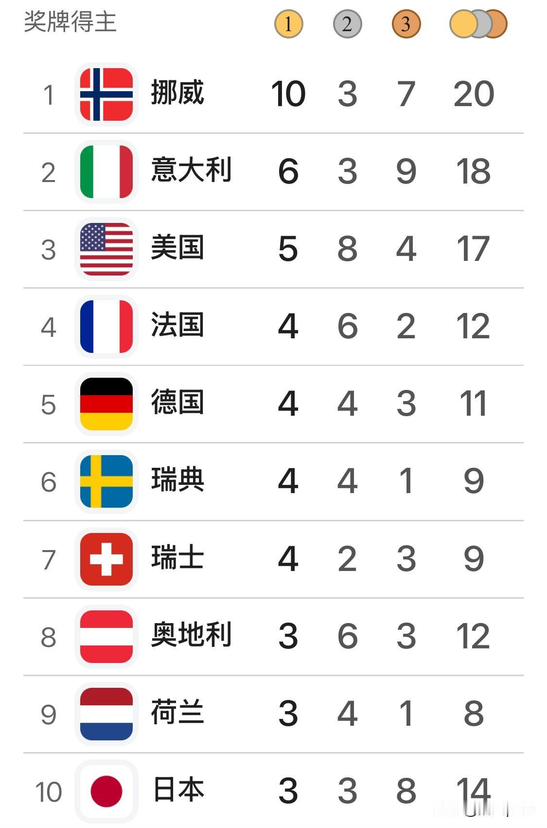 冬奥会奖牌榜实时,中国队4枚奖牌暂排第15,日本队14枚奖牌升至第4。美国17枚奖牌排名第三。 日本队的表现抢眼,在奖牌数量逐渐接近前三名挪威、意大利、美国。相对来说,亚洲另两个队伍中国、韩国稍显落后,分别有5枚奖牌进账。