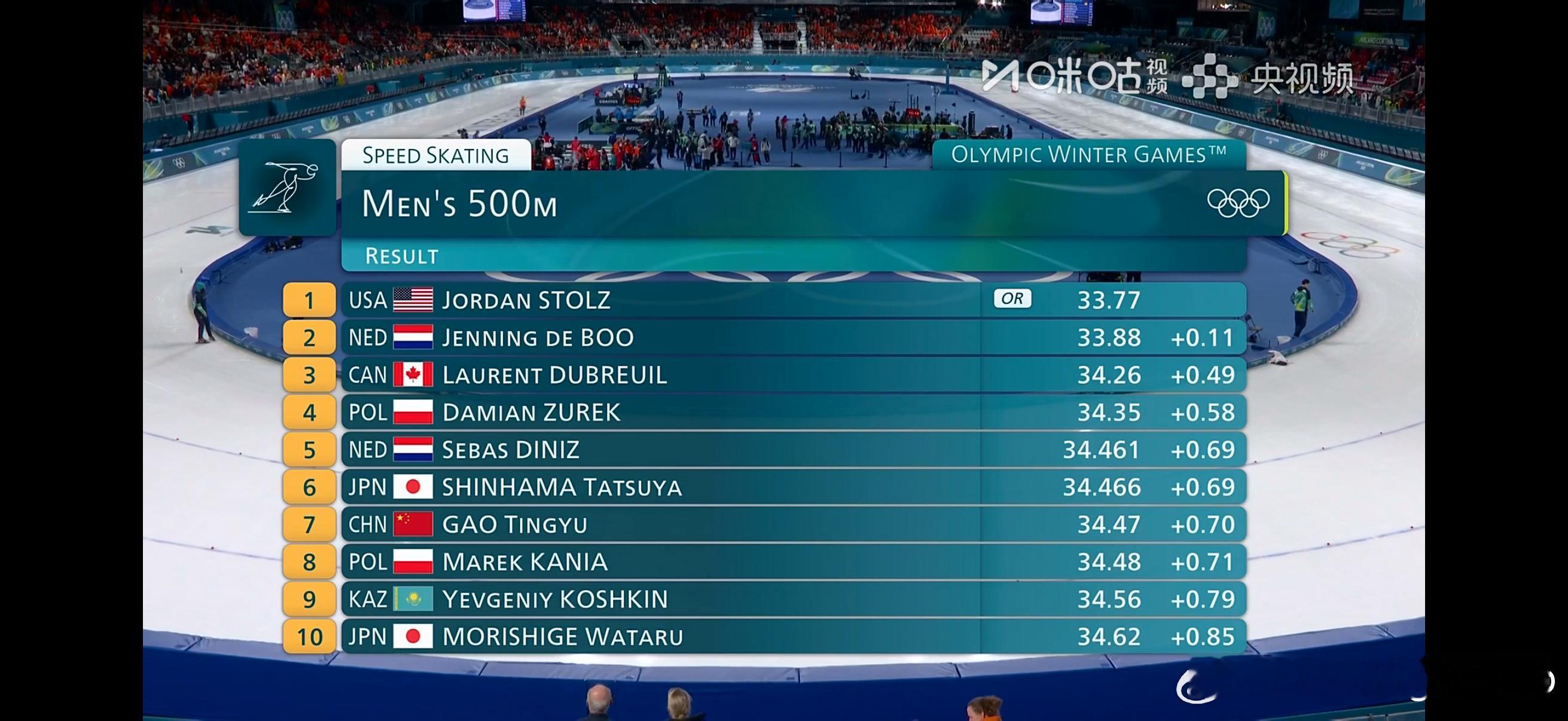 高亭宇男子500米米兰冬奥会速度滑冰男子500米决赛最终成绩🇨🇳高亭宇34秒