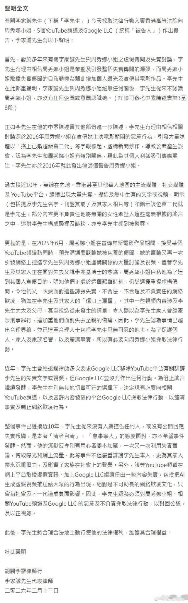 李家诚认为,谣言源于周秀娜在2016年主演电影期间的恶意行为,引发媒体以“搭上已婚超级富二代”为标题炒作,借此吸引媒体关注,而李家诚早在2016年就发律师函警告周秀娜,但近十年还是出现大量的不实报道,对李家诚构成骚扰及诽谤,让他感到被侮辱。