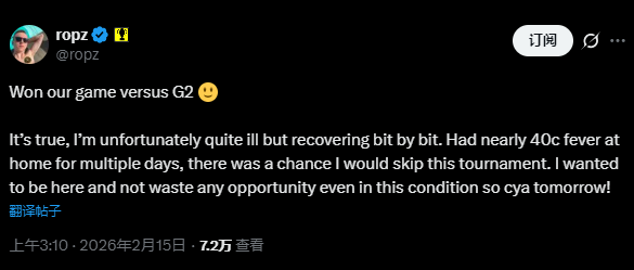 虎扑02月15日讯在今晨结束的PGL克卢日纳波卡瑞士轮首轮比赛中Vitality以2-1击败G2拿下开门红。而Vitality的ropz选手全场仅打出0.87rating的数据,图三更是只有3杀11死0.45rating。赛后ropz更新个人社交媒体: