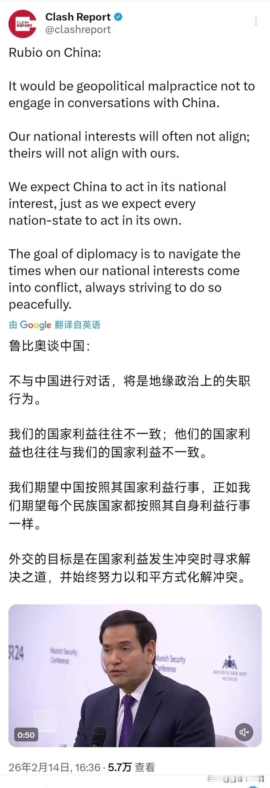 鲁比奥,真变了! 真让人没想到,以前一直对华强硬的鲁比奥,这次在慕尼黑安全会议上,说出了一番很理性的话。美国终于肯务实了! 他说:“美国必须和中国对话,不对话就是失职。中美利益不一样很正常,每个国家都会维护自己的利益,有分歧就和平处理。” 这话很实在,也很理性。 能让美国这么说话,说明一个事实:美国已经不能独自说了算,世界格局真的变了。 这一番表态,对中美关系是个好信号,也在为特朗普4月份的可能访华铺路。当然,我们也要清醒,嘴上缓和只是第一步,关键还要看实际行动,也不排除之后态度又变回去。 实力,才是话语权。 中国越强,世界越愿意和我们好好说话。