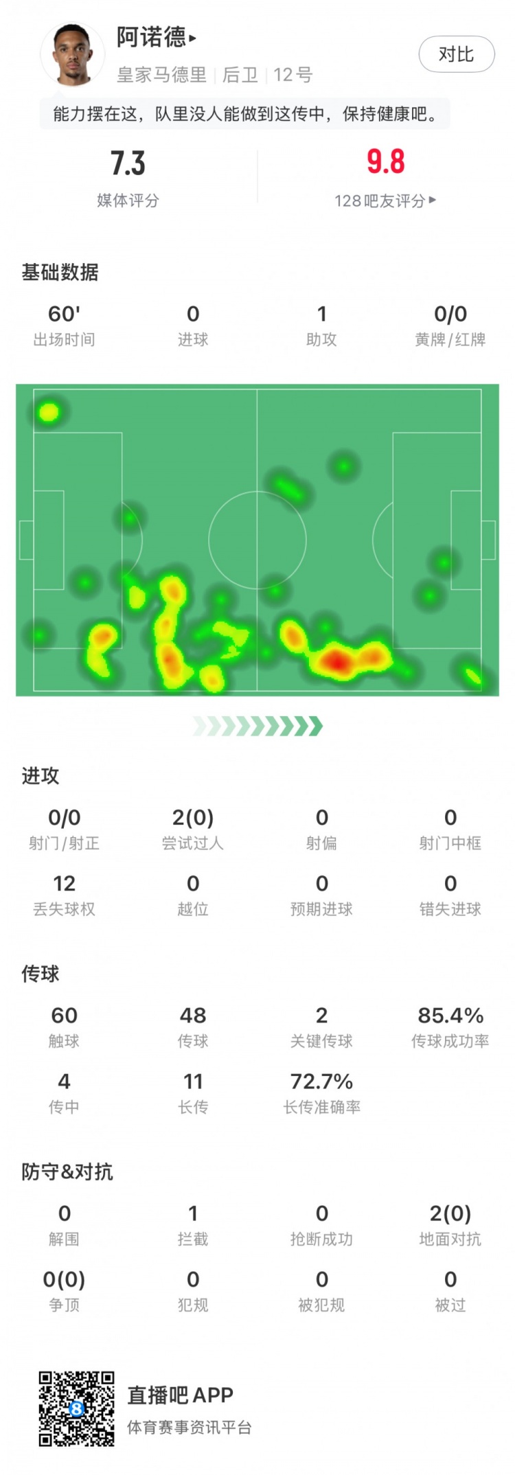 阿诺德本场数据:1次助攻,11次长传8次成功,获评7.3分