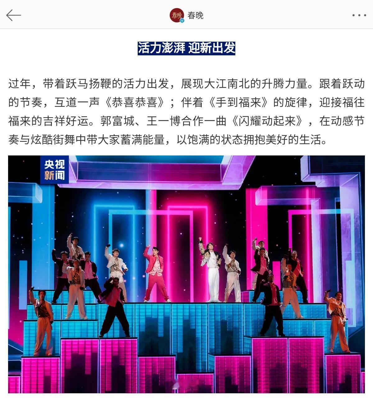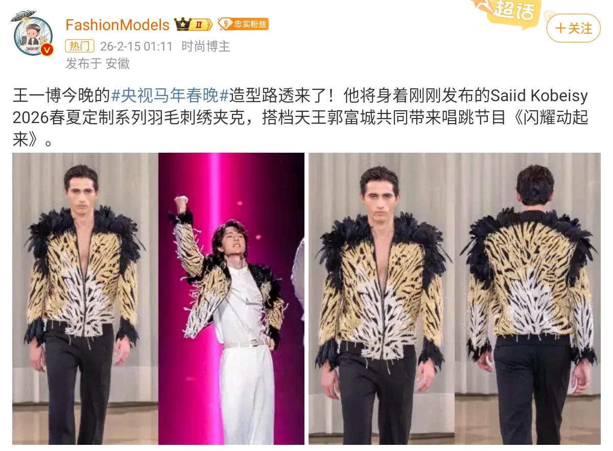 马年春晚最受期待舞台官宣了!王一博将与郭富城一起合作《闪耀动起来》,带来动感节奏炫酷街舞。这是王一博第三次登上春晚,第二次在春晚舞台上跳街舞。 王一博彩排身着1月27日刚刚发布的Saiid Kobiesy 2026春夏高定羽毛刺绣系列,超季全球首穿。这件高定夹克有着猛虎般的花纹,羽毛装饰在跳舞时更显灵动。