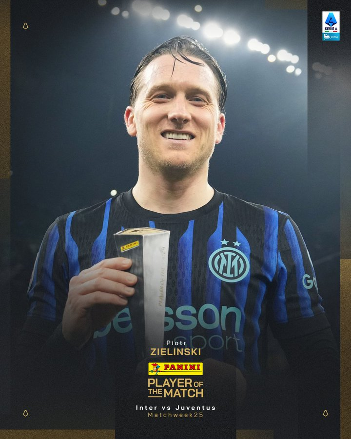 意甲官方:杰林斯基当选国际米兰vs尤文图斯全场最佳球员