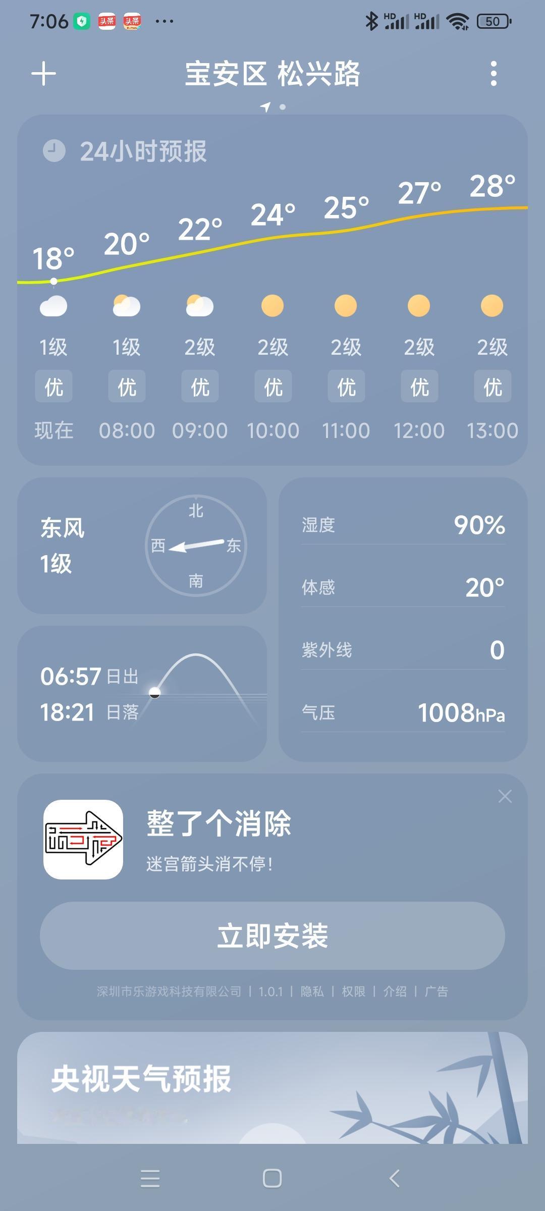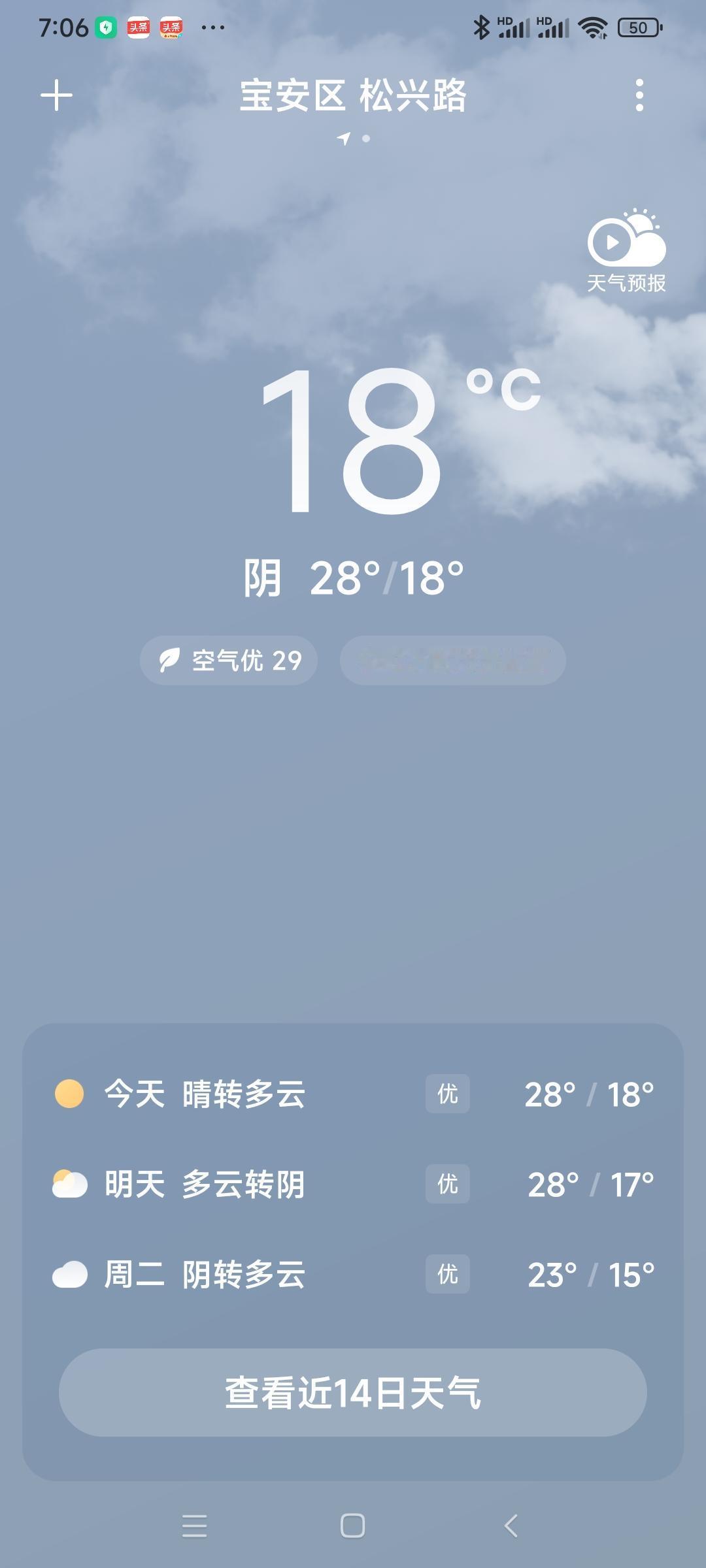 我的今日状态:😁轻松愉快 我这里的天气:🌤️多云深圳今日阴天多云,气温18度