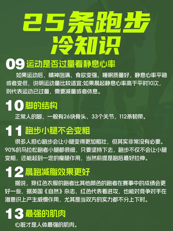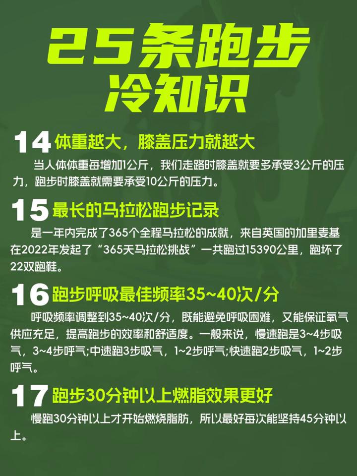25条跑步冷知识。 ·1、跑步会让你短暂变矮1厘米。在跑完一场全程马拉松后,你的身高会变矮1厘米左右,这是因为在跑步时椎间盘内大量水分受到冲击,从而通过盘壁流出,导致脊椎长度会压缩,大约一天后就会恢复正常。 ·2、跑者心脏与众不同。日常静止状态下,人的心脏每分钟泵血4~6升,而跑马拉松的朋友则需要心脏每分钟泵血多达16升。 ·3、跑多久可以绕地球一圈?如果你每天跑20公里,坚持跑2004天(大概5年6个月),你就会累积40080公里跑量,成功"绕"地球赤道一圈。 ·4、跑步前拉伸有坏处。在跑步前拉伸你的冷肌肉是弊大于利的,拉伸使得肌肉变得过于放松而无法快速进入应有的状态,正确的做法是跑步前多做弹跳或者跳跃类热身活动,拉伸环节放在跑完后。 ·5、运动完30分钟内放心吃。运动时肌肉纤维会产生微细损伤,研究发现运动后30分钟内是营养的最佳吸收时间,此时吃进去的食物可以直接用于修复肌肉组织和补充肝糖,不易储存为脂肪。 ·6、最长的马拉松跑步记录。马拉松路线其实是按照弯道的最短距离来算的,也就是切线。我们在比赛的时候如果不注意,很容易比最短距离跑多。聪明的跑者会花最少的力气跑出最接近赛道的真实距离,这是考验技术的一种方法,所以平时训练注意培养自己跑切线的习惯。 ·7、跑鞋的寿命。穿着以延长使用寿命。 ·8、晨跑减脂效果更好。以早晨起来进行有氧慢跑的减脂效果更好。但是如果有低血糖,则代表身体出现不适。 ·9、运动是否过量看静息心率。如果运动后精神饱满、食欲变强、睡眠质量好,静息心率平稳或者变低,说明运动量比较适宜;如果晨起静息心率高于平时10次,则代表运动已过量,需要减量或者休息。 ·10、正常人的脚一般有26块骨头、33个关节、112条韧带。 ·11、跑步小腿不会变粗。90%的马拉松跑者小腿都很细,只要坚持下去,跑步不仅不会让小腿变想,还能起到一定的瘦腿作用,当然前提是跑后最好拉伸。 ·12、晨跑减脂效果更好。以早晨起来进行有氧慢跑的减脂效果更好。但是如果有低血糖,则代表身体出现不适。 ·13、最强的肌肉。心脏才是人体最强的肌肉。 ·14、体重越大,膝盖压力就越大。当人体体重每增加1公斤,我们走路时膝盖就要多承受3公斤的压力,消除紧张情绪,抑制烟瘾发作。 ·15、跑步呼吸最佳频率35~40次/分。呼吸频率调整到35~40次/分,既能避免呼吸困难,又能保证氧气。 ·16、跑步30分钟以上燃脂效果更好。慢跑30分钟以上才开始燃烧脂肪,所以最好每次能坚持45分钟以上。 ·17、跑步更有助于戒烟。跑步时身体会释放内啡肽,与尼古丁竞争结合受体,使人产生免疫力。 ·18、过量跑会"变老"。很多跑步大神面部看起来更显老,其原因是由于大跑量之后体内产生过量自由基导致的,自由基又称游离基,化学性质活泼,具有强氧化性。跑步时需要放松,但是握拳这个小动作会不由自主地使浑身肌肉都处于半紧张状态,握拳会导致人体消耗更多体力,使人更加疲惫,跑步时握紧拳头是不利于跑步的。 ·19、跑步让你变得更聪明。研究表明跑步可以促进大脑的神经生长因子的分泌,这是一种可以保护和修复神经细胞的蛋白质。跑步还可以改善大脑的血液供应量。 ·20、跑马一周后体重反弹率高达70%。运动营养学专家Andrea Cespedes通过20年的研究发现,逾70%跑友会在跑马后会持续产生"我应该多吃一点"的想法,让自己的摄入量超标。且当我们跑到精疲力竭时,反而会紧紧抓牢体内存储的脂肪,消耗的反而可能是肌肉。 ·23、跑步的二八定律。在跑步的初期,80%到82%的人会在三个月内放弃,但最终只有不到20%的人会坚持下来。 ·24、跑步消耗的肌肉数量。每跑一步,需要用到身体200块肌肉,这也是为什么跑完步后会感到全身疲惫。 ·25、跑步机"陷阱"。在跑步机上跑步时,如果手抹扶手,会直接导致少消耗20%的热量。