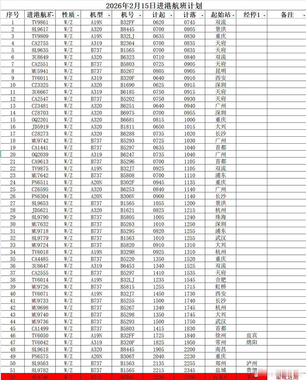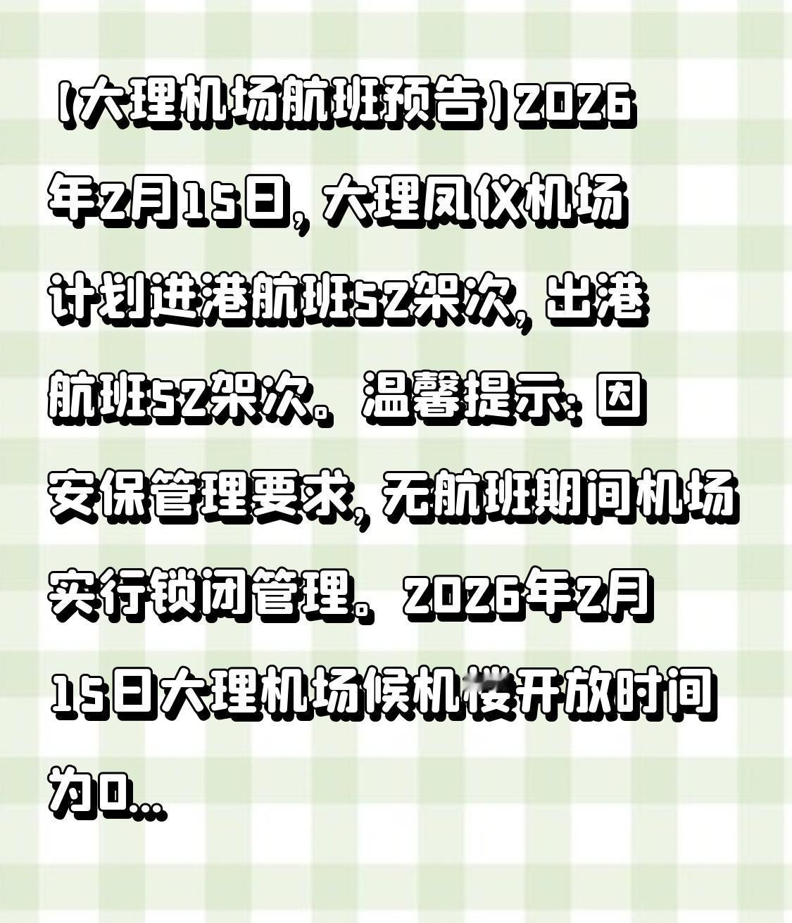 【大理机场航班预告】2026年2月15日,大理凤仪机场预计进港航班52架次,出港航班52架次。 温馨提醒:鉴于安保管理规定,无航班时段机场将实施锁闭管理。2026年2月15日大理机场候机楼于05:00开放,请各位旅客合理规划出行时间。 机场航班时刻表 机场航班调整 大理国际机场 凤仪机场
