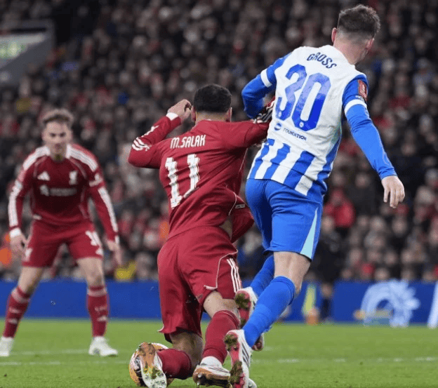 “布莱顿球员围住裁判抗议,但无济于事。萨拉赫突入禁区,手臂几乎顶到卡迪奥卢的胸口,将对方撞倒。布莱顿认为这是对方犯规。萨拉赫用手轻触利物浦队徽,再次引来球迷欢呼。这记点球罚得信心十足,他为索博斯洛伊的进球送出绝妙助攻,又将点球大力抽射向斯蒂尔左侧。”