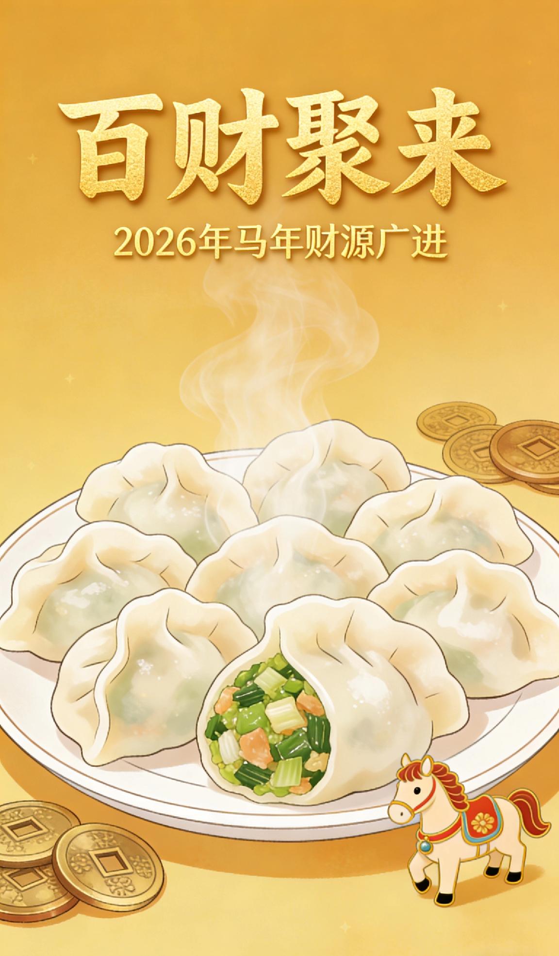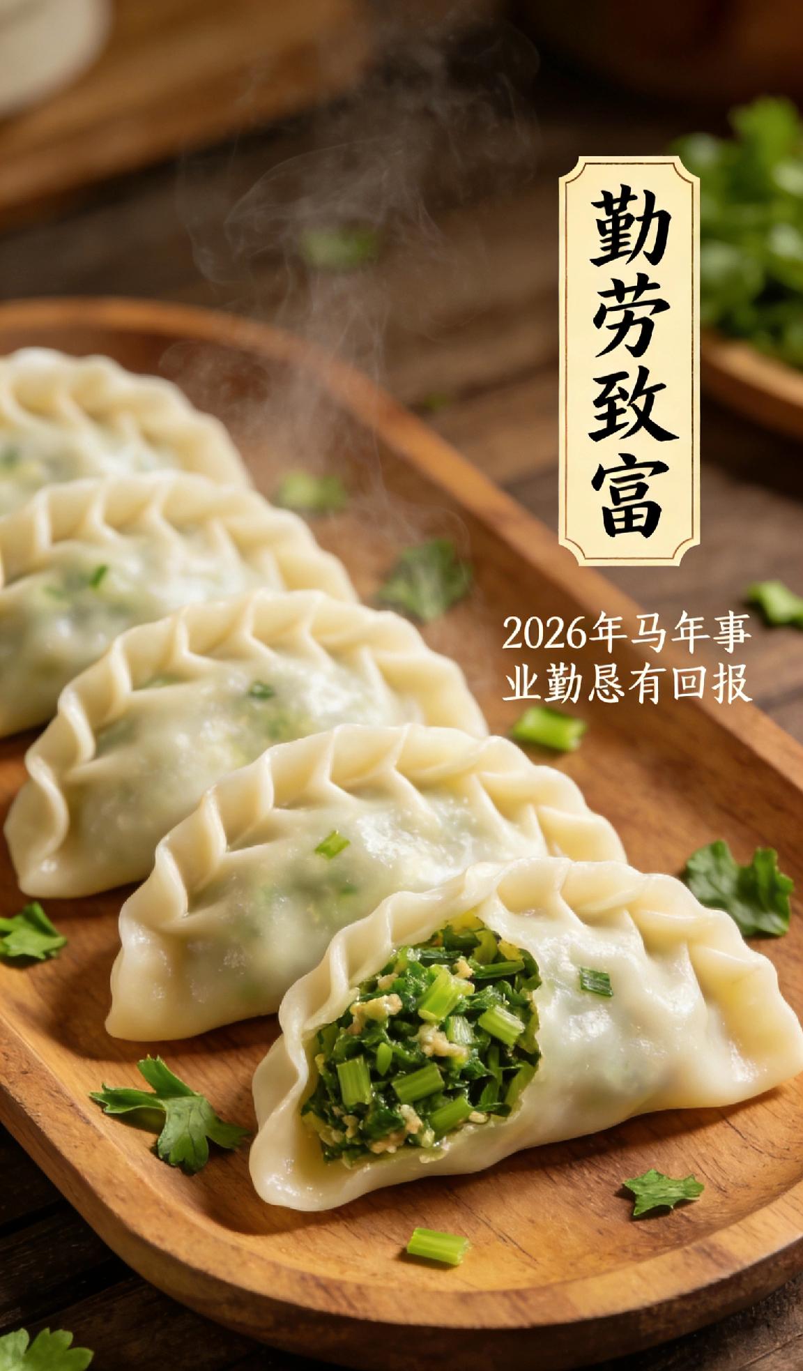 盲盒彩蛋(包整颗,记得做记号) 这是最有仪式感的玩法,通常会包入1-2个,谁吃到谁有福: 1. 硬币/金币巧克力:寓意财运亨通、招财进宝,马年讨个“马上有钱”的好兆头 。 2. 红枣/蜜枣:寓意日子甜美、红红火火,也有“早生贵子”的祝福 。 3. 花生(长生果):寓意健康长寿、生生不息,保佑家人平安康健 。 4. 栗子:与红枣搭配,取“早立子”的谐音,祝福家庭兴旺。 5. 糖果:寓意生活甜蜜、顺心如意,大人小孩都喜欢 。 🥟 馅料祈福(融味道,全家共享) 通过食材谐音传递祝福,适合全家一起吃,马年对应不同心愿可选: 1. 白菜馅:谐音“百财”,寓意百财聚来,马年财源广进。 2. 韭菜馅:谐音“久财”,寓意福气与财运长长久久,马年好运不断。 3. 芹菜馅:谐音“勤财”,寓意勤劳致富,马年事业勤恳有回报。 4. 香菇馅:形似元宝,寓意“鼓财”,象征钱包鼓鼓、马到成功。 5. 牛肉馅:寓意“牛气冲天”,搭配胡萝卜更有“红红火火”的马年气势。 6. 鱼肉馅:寓意“年年有余”,象征马年财富盈余,吉庆有余。 💡 马年特别建议 今年是丙午马年,若想更应景,可在馅料中加入玉米(金玉满堂)或胡萝卜(红红火火),既符合马年的活力氛围,又能让营养更均衡。2026马年大吉 年味十足 年夜饭菜谱