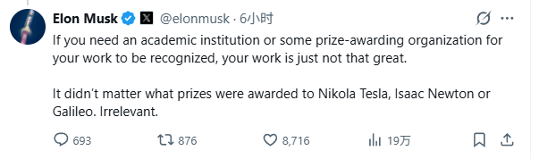 马斯克在回应网友对他2025年的一条关于SpaceX工程师成就的帖子的评论时称:“如果你需要学术机构或颁奖组织来认可你的工作,那说明你的工作并没有那么出色。尼古拉·特斯拉、艾萨克·牛顿或伽利略获得过什么奖项并不重要。无关紧要。”马斯克在2025年的那条帖子中说:“SpaceX在火箭和卫星技术进步方面所做的前沿研究,比地球上所有大学实验室加起来都更有意义。但我们不使用‘研究员’这个虚伪且缺乏问责性的词。只用‘工程师’。”