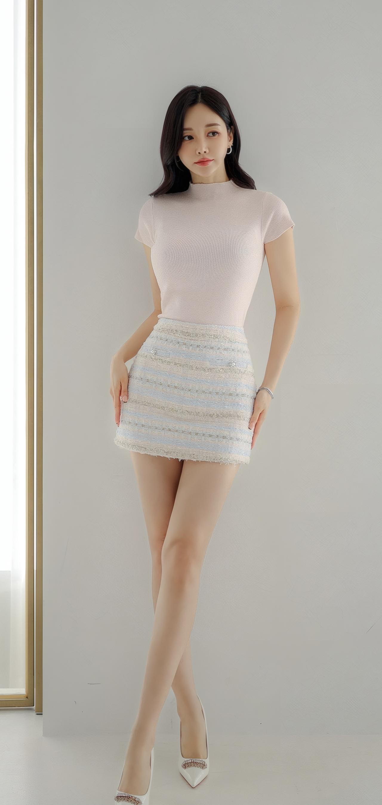 温柔粉色高领衫搭配条纹短裙,甜美又优雅!