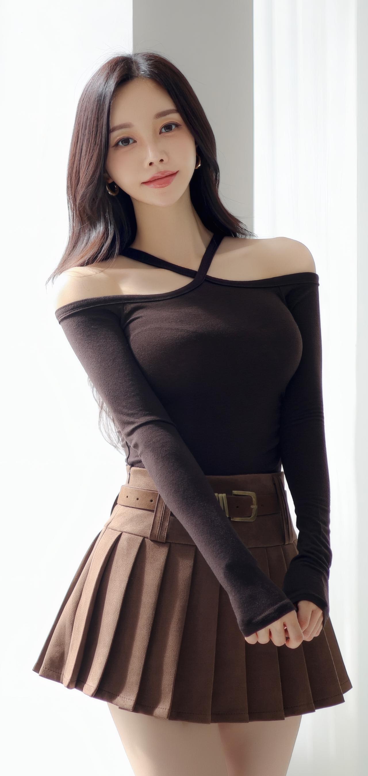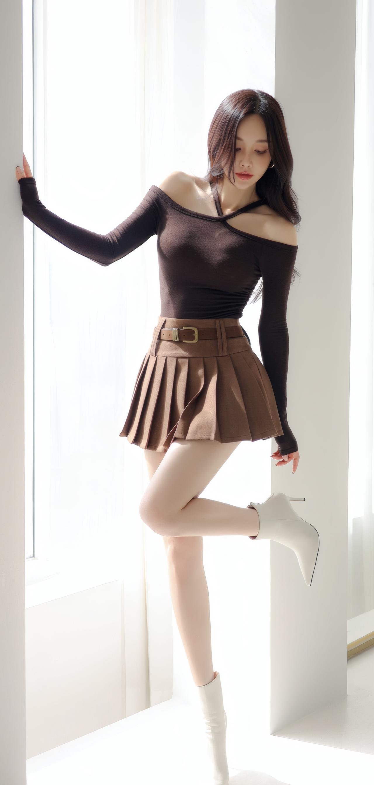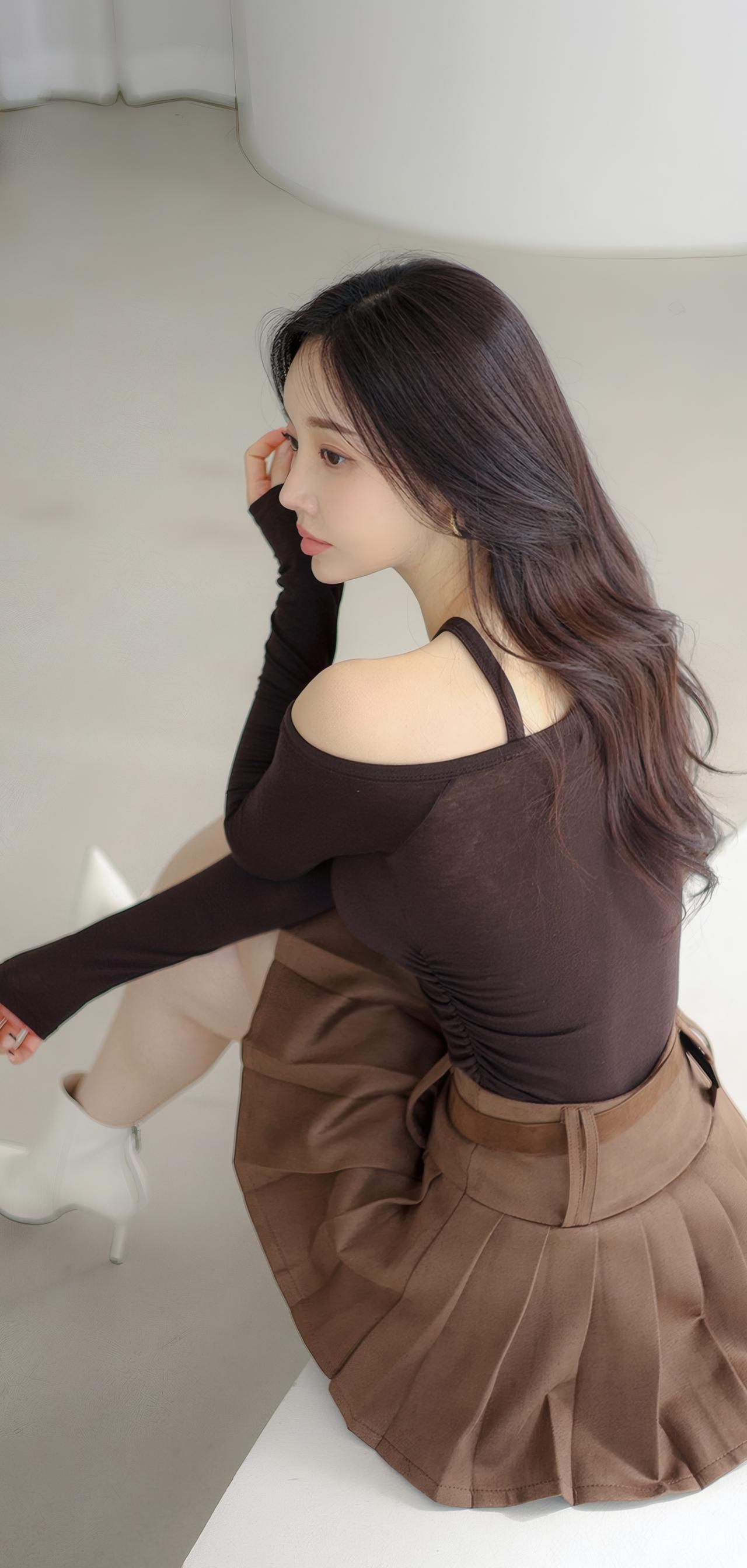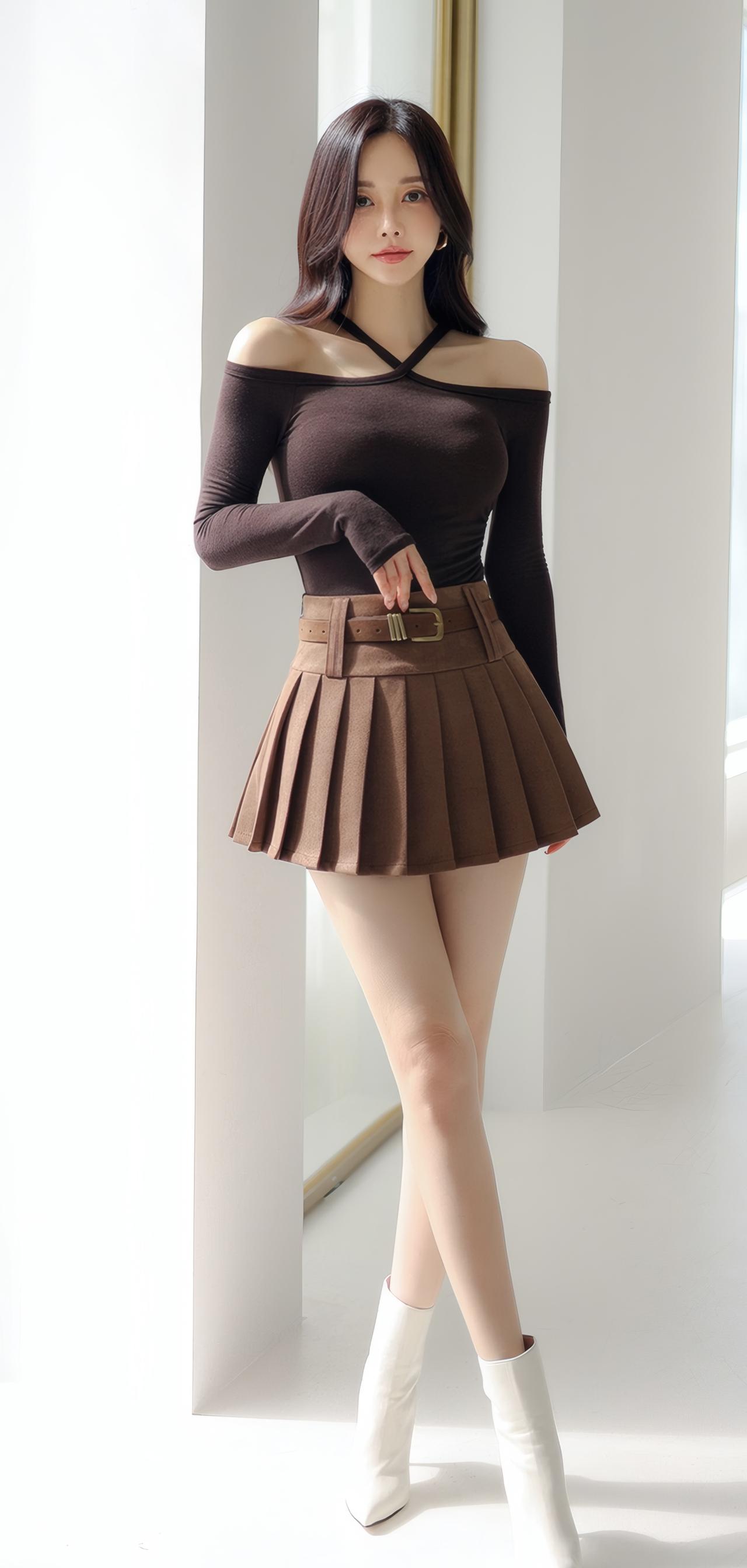 时尚穿搭指南:棕色露肩上衣+百褶短裙,搭配白色靴子,优雅又时髦!