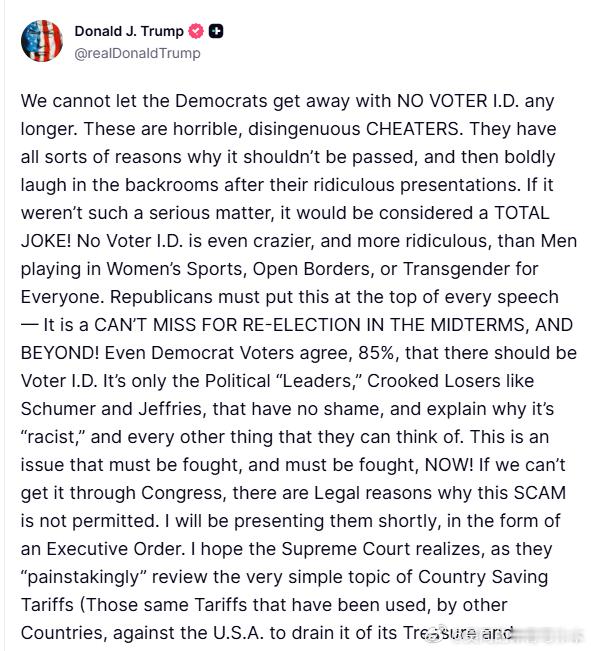 如果不是事关重大,这简直就是个天大的笑话!“选民身份识别”政策比允许男性参加女子体育比赛、开放边境或允许跨性别者平等更疯狂、更荒谬。共和党人必须把这一点放在每次演讲的首位——这对于中期选举乃至未来的连任至关重要!