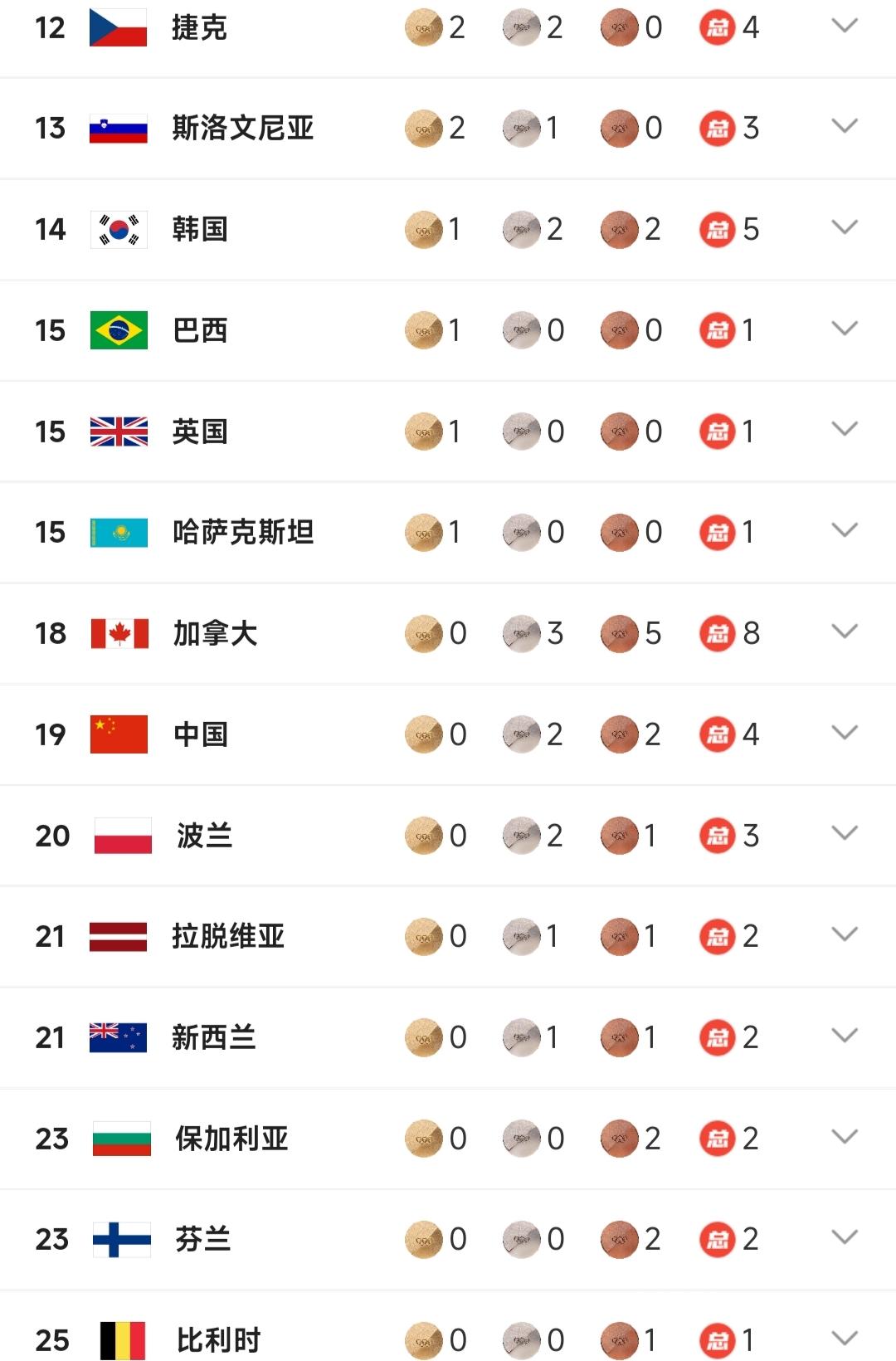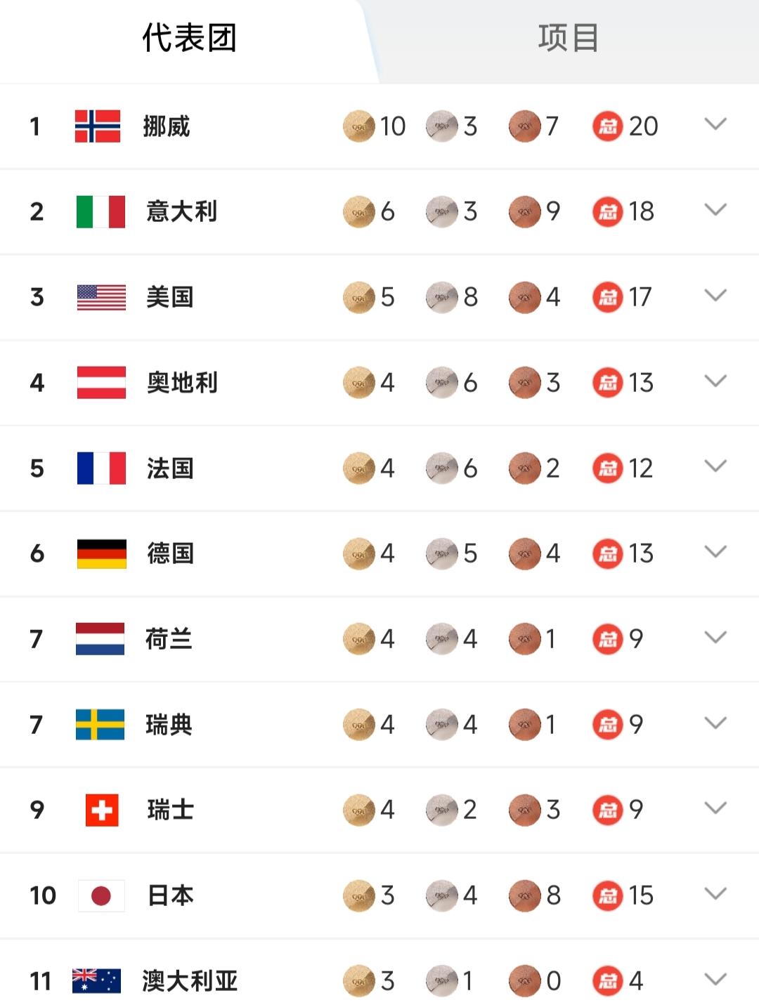 米兰冬奥会最新金牌榜出炉! 谷爱凌闯进决赛,中国队暂时掉第19! 挪威十枚金牌继续领跑,意大利6金,美国5金! 北京时间2月15日,米兰冬奥会第九比赛,下面就看看部分赛程结果简述。 ①短道速滑男子1500米决赛,中国选手孙龙和刘少昂运气欠佳,双双是受到英国的特雷西摔倒的影响导致摔倒。最终荷兰的范特沃德夺金,韩国的黄大宪银牌,拉脱维亚选手获铜。孙龙因为膝盖伤势未得完赛获得第八名,刘少昂起身坚持完成位居第七名。林孝俊则是因为失误止步四分之一决赛,看起来肩伤和年龄是对竞技状态造成极大影响。 ②钢架雪车女子组决赛,中国选手赵丹获得第八名,刷新个人最好成绩,而梁雨欣排名第21位。奥地利的弗洛克夺冠,德国选手包揽银铜牌。 ③速度滑冰男子500米决赛,美国的斯托尔兹33秒77以破奥运会纪录的成绩加冕冠军,中国三位选手均无缘领奖台,高亭宇34秒47位居第七,薛智文和廉子文分获第11和第14名。 ④自由式滑雪女子大跳台预赛,中国两位选手顺利闯进决赛,刘梦婷前两跳都表现稳健,均拿到80分,以第九名过关;谷爱凌第1和第3跳发挥优异,排名第二强势晋级,她真是大心脏选手,第2跳失误之后迅速调整过来,心理素质极强,期待她们能在奖牌争夺战持续闪耀。