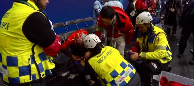 在今天凌晨举行的米兰冬奥会短道速滑男子1500米A组决赛中,孙龙 摔倒,通过直播画面可以看到孙龙膝盖有流血,赛后被搀扶着离开赛场。