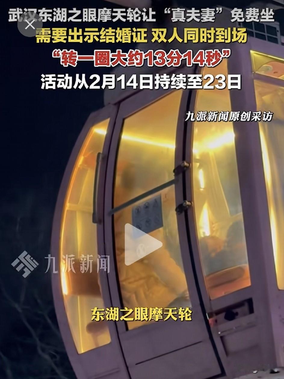 武汉的真夫妻赚翻了!夫妻俩带结婚证坐摩天轮,免费!可以带宝宝哦! 东湖之眼昨天官宣:2月14日到23日,只要是真夫妻,凭结婚证,就能免费坐一次摩天轮! 工作人员说,上午十点半还不用排队,带孩子也行(90厘米以下免票)。关键是——结婚多少年都行!刚领证的也行!只要两口子都在场,就能免单。 注意啊,单人不行,送人也不行,必须夫妻双双到场。 网友看了说啥的都有,简直是吵翻了天。 不屑一顾者: “真夫妻都不想坐![捂脸]” “坐了只会浪费13分14秒的时间并不能改善平日里的鸡毛蒜皮!” “笑死了,有几个结婚多年的夫妻,愿意跑这么远做个免费的摩天轮?” “想坐的都不是真夫妻 真坐上去的也都不夫妻!” 称赞者: “今年老婆发烧,请假在家到了下午好多了。我就和她一起去坐了的!” “我们在外地,等回武汉就去,如果孩子不能上,就让大的带小的下面等着!” “安排,带上我老公一起去[呲牙]” “结婚29年了,想和老婆一起坐[奸笑][奸笑][奸笑]” 看了评论区,就能知道,这日子跟谁过真的不一样! 正如列夫·托尔斯泰,在长篇小说 《安娜·卡列尼娜》中所言,幸福的家庭都是相似的,不幸的家庭各有各的不幸。 东湖之眼,摩天轮转一圈正好13分14秒,寓意“一生一世”。最高点55米,东湖20公里美景尽收眼底。 或许在这个“速食爱情”的时代,大家心底还是愿意相信点什么的——哪怕只是坐一圈13分14秒的摩天轮,也想找个理由,让某一天变得特别一点。 这波操作,简直是给真夫妻发糖!你动心了吗? 素材来源:九派新闻,侵联删!