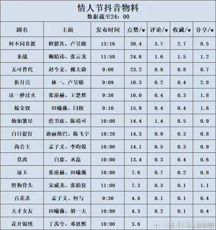 情人节物料的各剧,微指,百指,🫘热度排行 ,檀健次何不同舟渡都断层了