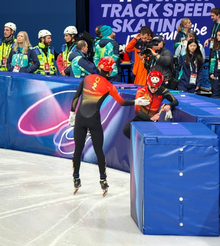 短道速滑男子1500米1/4决赛,林孝埈摔倒,同组队友孙龙以小组第三晋级半决赛,赛后孙龙轻拍安慰林孝埈。