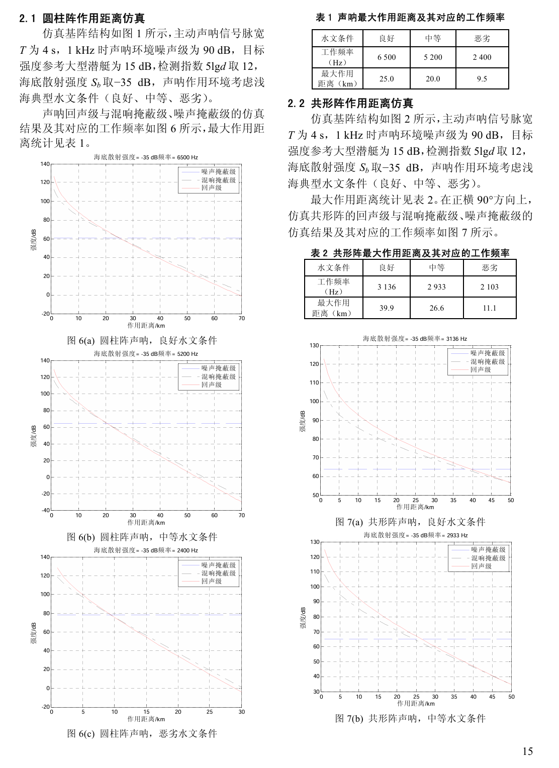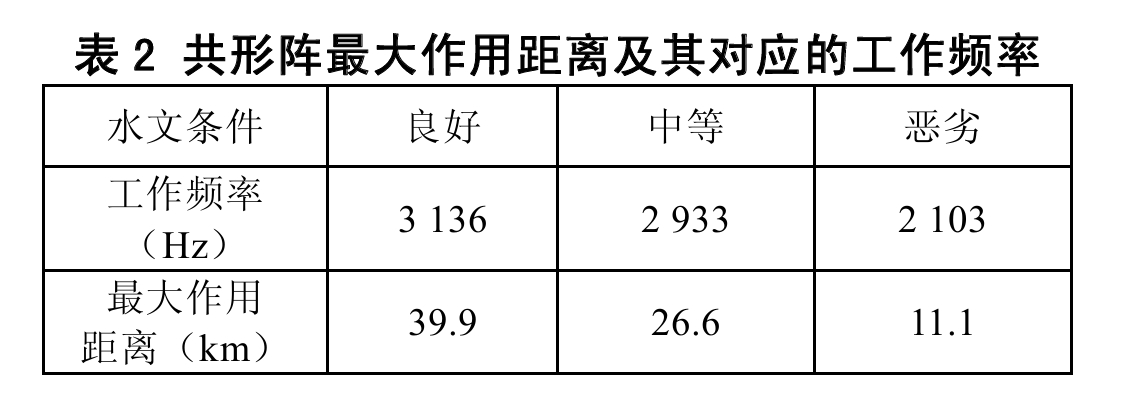 对比分析上述圆柱阵与共形阵的仿真结果可知,在浅海良好、中等、恶劣三种水文条件下,共形阵声呐正横方向探测的工作频率比圆柱阵的工作频率分别降低51.8%、43.6%和 12.4%,作用距离分别提高59.5%、33.0%和 16.8%,工作频率明显下降,作用距离显著增加,这对于提高小型舰艇的低频远程探测能力具有非常重要的应用价值。