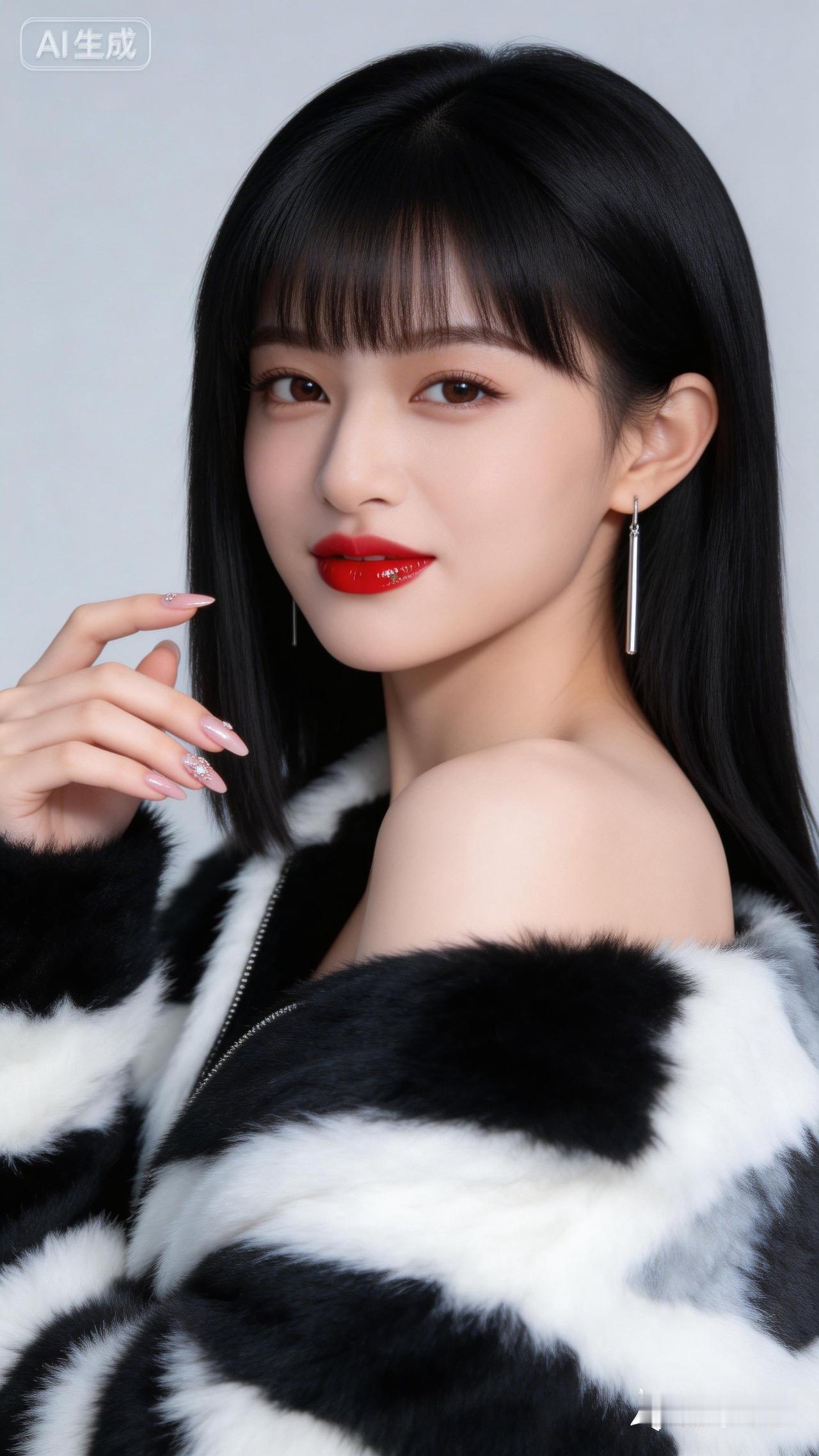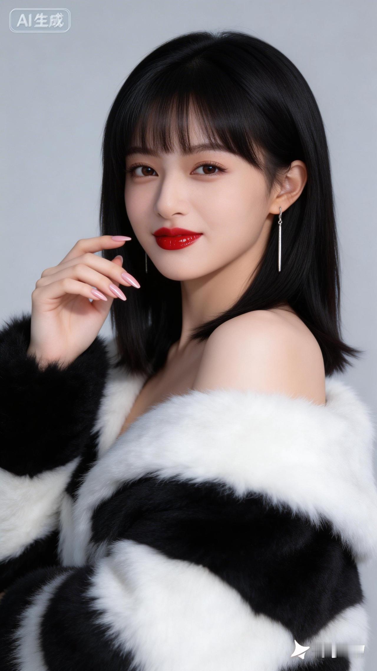 优雅黑发红唇,黑白毛绒外套,尽显时尚魅力!