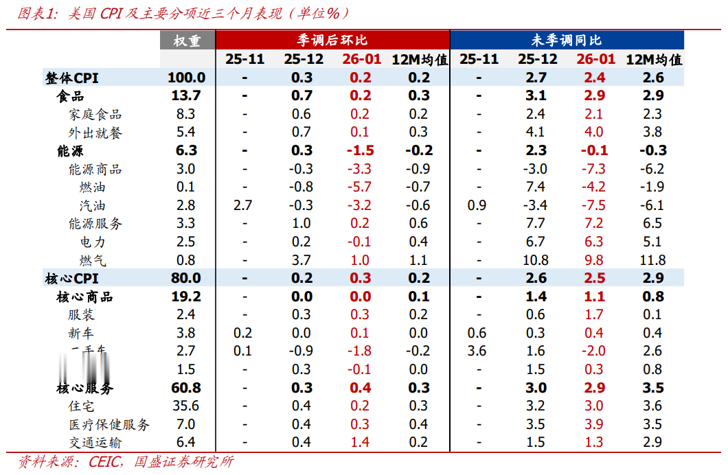 整体表现:美国2026年1月未季调CPI同比2.4%,低于预期和前值,相比25年9月连续3个月回落;核心CPI同比2.5%,持平于预期,低于前值。季调后CPI环比0.2%,低于预期,持平12个月均值0.2%;核心CPI环比0.3%,持平预期,高于12个月均值0.2%。