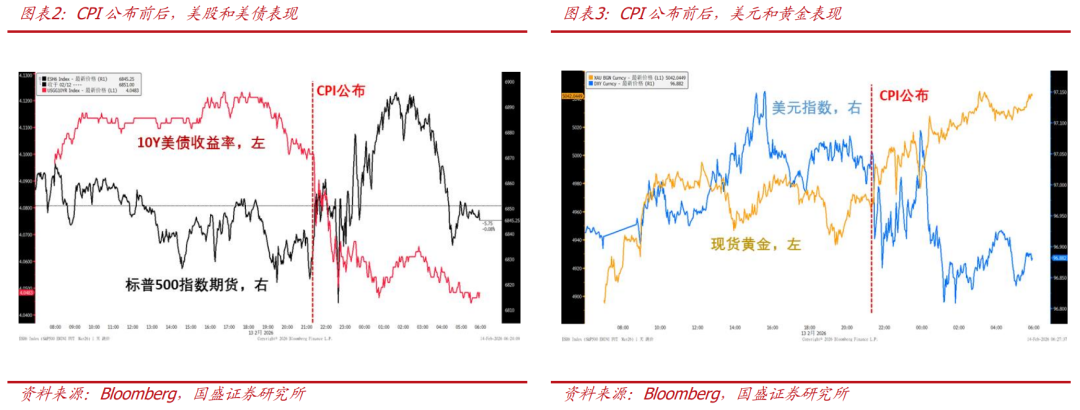 大类资产表现:1)非农公布后,美股、美债收益率、美元指数先涨后跌,黄金先跌后涨。截至02/12收盘,标普500、纳斯达克、道琼斯指数分别跌0.00%、0.16%、0.13%,10Y美债收益率上行2.77bp至4.17%,美元指数涨0.06%至96.92,现货黄金上涨1.22%至5082.86美元/盎司;2)CPI公布后,美股先上行后回调,美债收益率、美元指数下行,黄金上涨。截至02/14收盘,标普500、纳斯达克、道琼斯指数分别+0.05%、-0.22%、+0.10%,10Y美债收益率下行4.79bp至4.05%,美元指数跌0.05%至96.86,现货黄金上涨2.41%至5042.81美元/盎司。