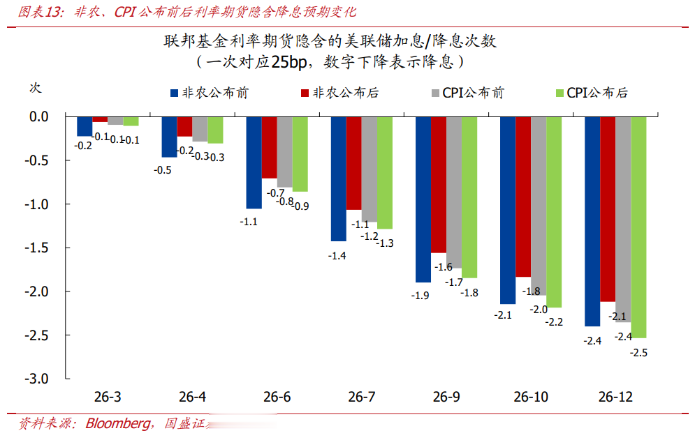 降息预期变化:1)非农公布后,市场对美联储降息的预期有所降温。利率期货隐含的3月降息次数基本归零(0.22→0.06次),6月降息次数不足1次(1.05→0.71次),2026全年降息次数由2.4次下降至2.12次;2)CPI公布后,市场对美联储降息的预期则再度小幅升温。利率期货隐含的3月降息次数基本持平(0.09→0.10次),6月降息次数由0.81次升至0.86次,2026全年降息次数由2.36次升至2.53次。