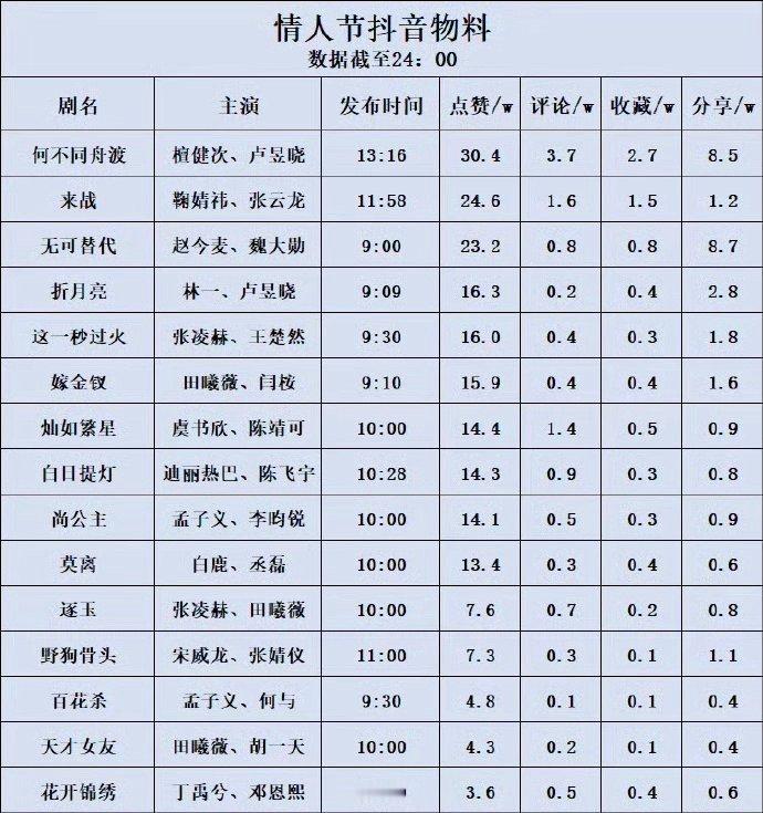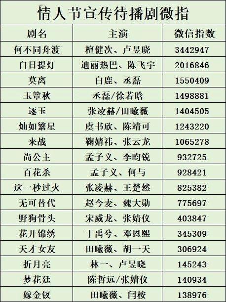 情人节待播剧物料数据汇总,檀健次《何不同舟渡》微指第一,百指第一,抖点赞第一☝?