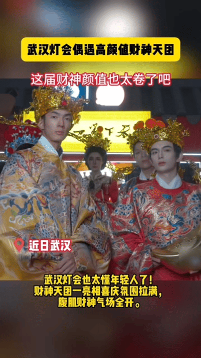 武汉灯会偶遇高颜值财神天团这届财神颜值也太卷了吧马年新春氛围感直接拉满!武汉灯会惊现“顶流财神天团”,俊男靓女版财神身着华服亮相,传统喜庆与高颜值碰撞,流光溢彩的花灯搭配养眼阵容,游客追着合影沾喜气,2026年的第一波好彩头,从这里领走!