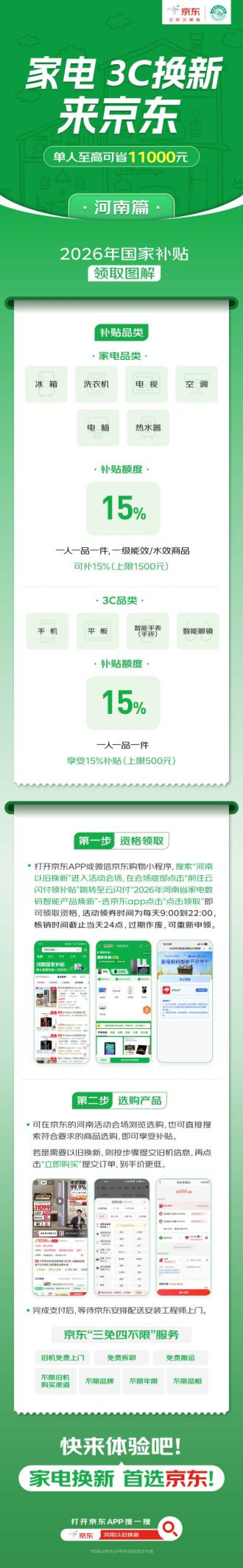 上京东,消费者购买活动指定的冰箱、洗衣机、电视、空调、电脑、热水器产品,单件/单次至高补贴1500元;购买活动指定的手机、平板、智能手表手环、智能眼镜产品,单件/单次至高补贴500元。单人累计至高可省11000元!
