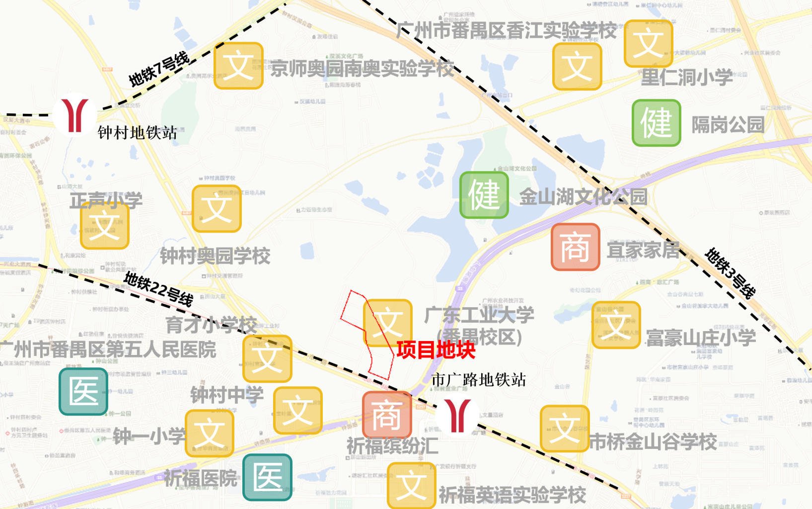 番禺区钟村街市广路北侧地块南侧为市广路,邻近22号线,教育配套层面,育英小学、钟村中学、金山谷学校等。