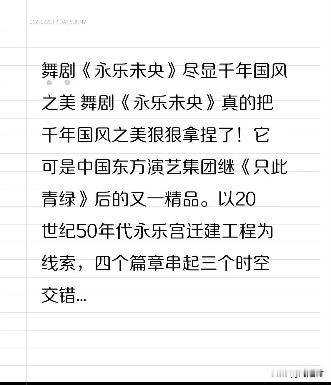 舞剧《永乐未央》尽显千年国风之美 舞剧《永乐未央》尽显千年国风之美!它是中国东方演艺集团继《只此青绿》后的又一精品,将千年国风之美展现得淋漓尽致。该剧以20世纪50年代永乐宫迁建工程为线索,通过四个篇章串起三个时空交错的故事,讲述了文物工作者的文化守护史诗。 主创团队历时两年半提炼四重美学。“藻井群舞”展现古建筑层次感,呼应东方哲学;“蓝釉角神”用光影重现失传釉彩;“拱眼壁伎乐”复活壁画乐舞场景。2026年河南春晚上,它让元代壁画“破壁重生”,凭借文化、技术与叙事的融合成为国风典范,尽显千年国风之美!
