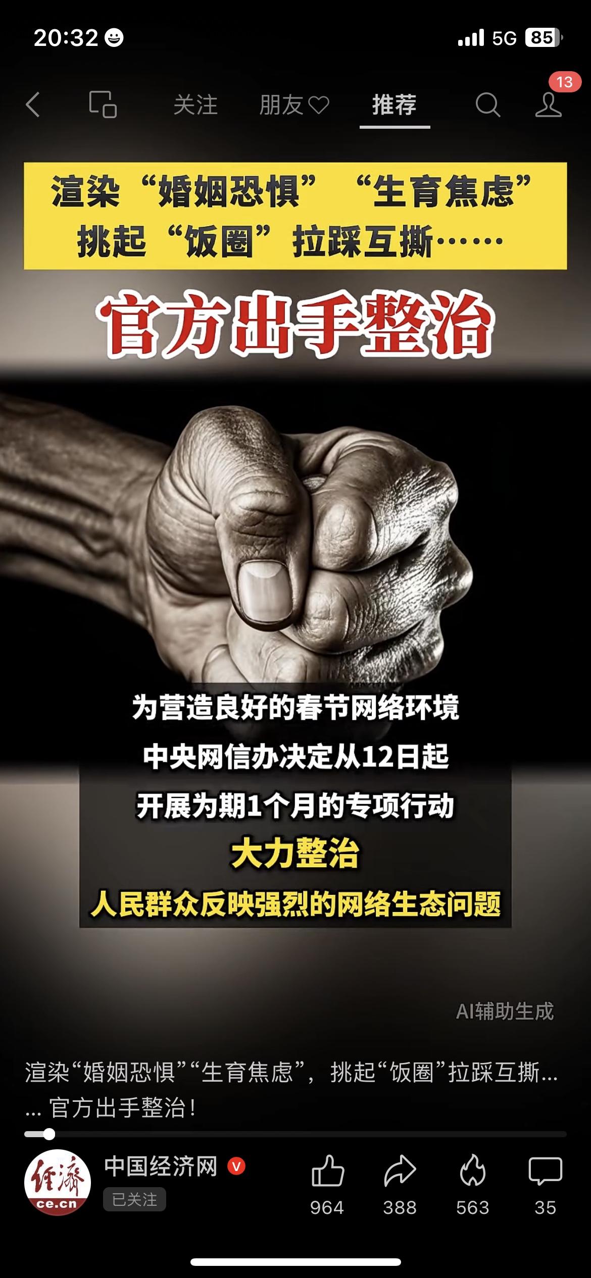 中央网信办重磅出手!2月12日起,开展为期1个月的春节网络环境专项整治,重点严打渲染婚姻恐惧、生育焦虑、挑动男女性别对立! 早就该管管了! 中国社科院2025年婚恋观报告显示,62.3%的年轻人表示,自己的婚恋观被网络极端言论影响过,38.7%的人因此产生了恐婚恐育情绪。 打开手机,全是“婚姻是女人的坟墓”“生孩子毁一生”“男人没一个靠得住”的极端话术,拿个例当普遍,放大矛盾制造焦虑,把好好的网络环境搞得乌烟瘴气。 尤其是春节回家,本来是阖家团圆的日子,结果刷到这些内容,要么跟家人吵架,要么对婚姻生育越来越抵触,完全是负能量绑架。 这次整治,不是不让大家说话,是不让那些为了流量无底线制造对立、渲染焦虑的账号,绑架普通人的人生选择。 记住:结不结婚、生不生孩子,从来都没有标准答案,日子是自己过的,不是别人嘴里的模板。 你被网上的恐婚恐育、性别对立言论影响过吗?你支持这次专项整治吗? 清朗春节网络环境 拒绝婚姻焦虑 拒绝性别对立