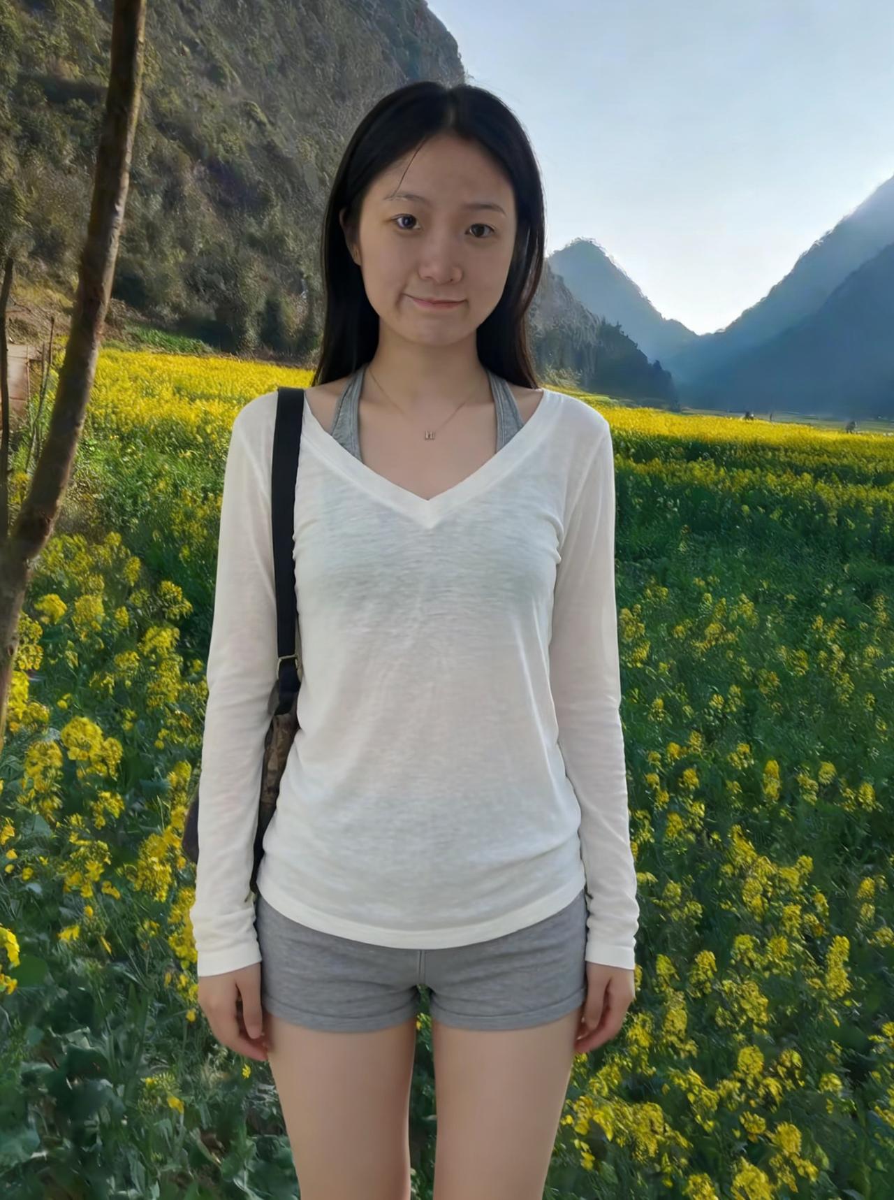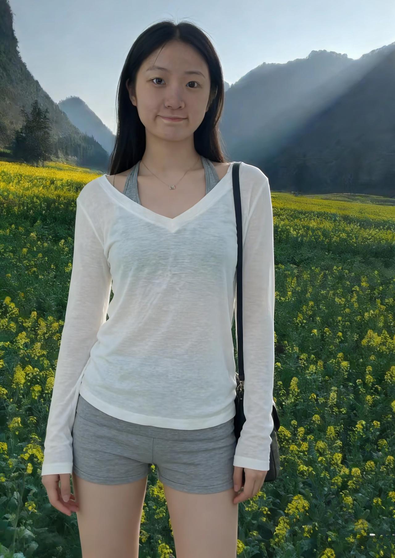 油菜花把天空染成蜜色 她站在中央,像一首未完成的绝句 白衫是留白,灰裤是韵脚 背包里装着半袋山风,和一整个春天的秘密 ~ 山影在她身后起伏,像沉默的观众 看她在花海里,把自己站成一株会笑的花 风过处,花穗轻摇,她的发梢也轻摇 每一次呼吸,都和花田的呼吸叠在一起 ~ 她的影子,是花田里最深的绿 比所有金黄都更接近土地 她的目光,是比阳光更暖的光 落在花上,花就开得更烈 落在心上,心就软成一汪春水 ~ 她走了,花田还在等 等她的白衫再掠过金浪 等她的笑涡再盛下阳光 等她再回来,把春天重新唤醒