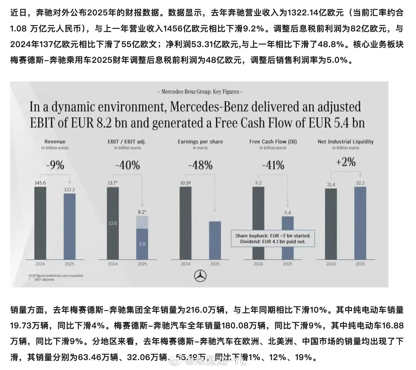 营收 1322 亿欧元,同比 -9.2%,总体收入还好调整后息税前利润 82 亿欧元,同比少了 55 亿,这个已经影响很大了净利润 53 亿欧元,同比 -48.8%,这个没办法调回来了乘用车板块利润率仅 5%😂,豪华车受量的影响太大