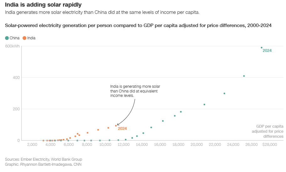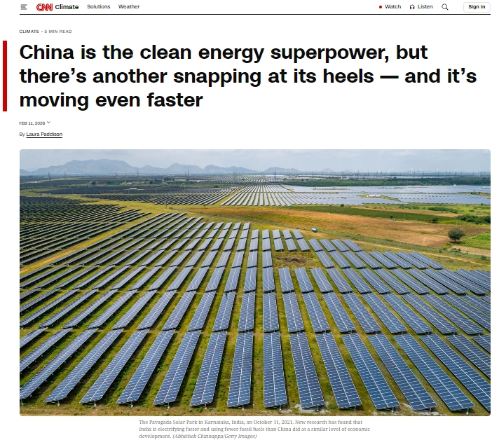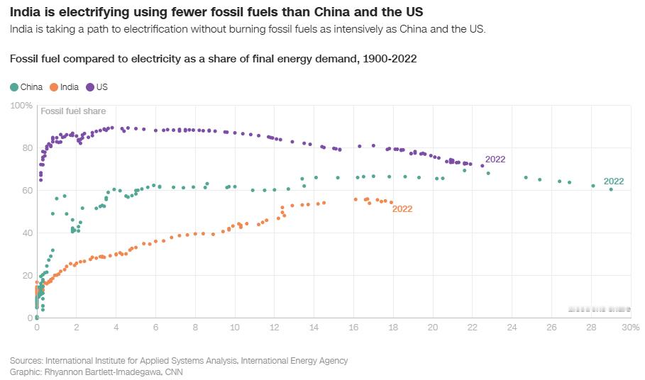 CNN说的,就是我前些天介绍Ember的说法:印度在与中国“相同发展阶段”(现在比中国2012年),绿色能源占比更高。再吹下,就是印度比中国先成为“电力王国”,各国学习中国绿色转型,但改说成学习印度。印度现在远不如中国2012年,电力王国也是胡吹,但绿色能源发展是快,要感谢中国。