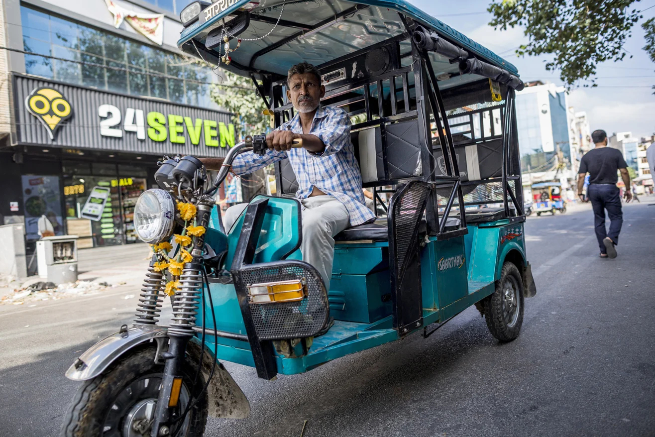 普雷姆·钱德是三轮突突车司机,每天在德里繁忙的街道穿梭。和这城市成千上万辆人力车一样,钱德也换电动了(图)。