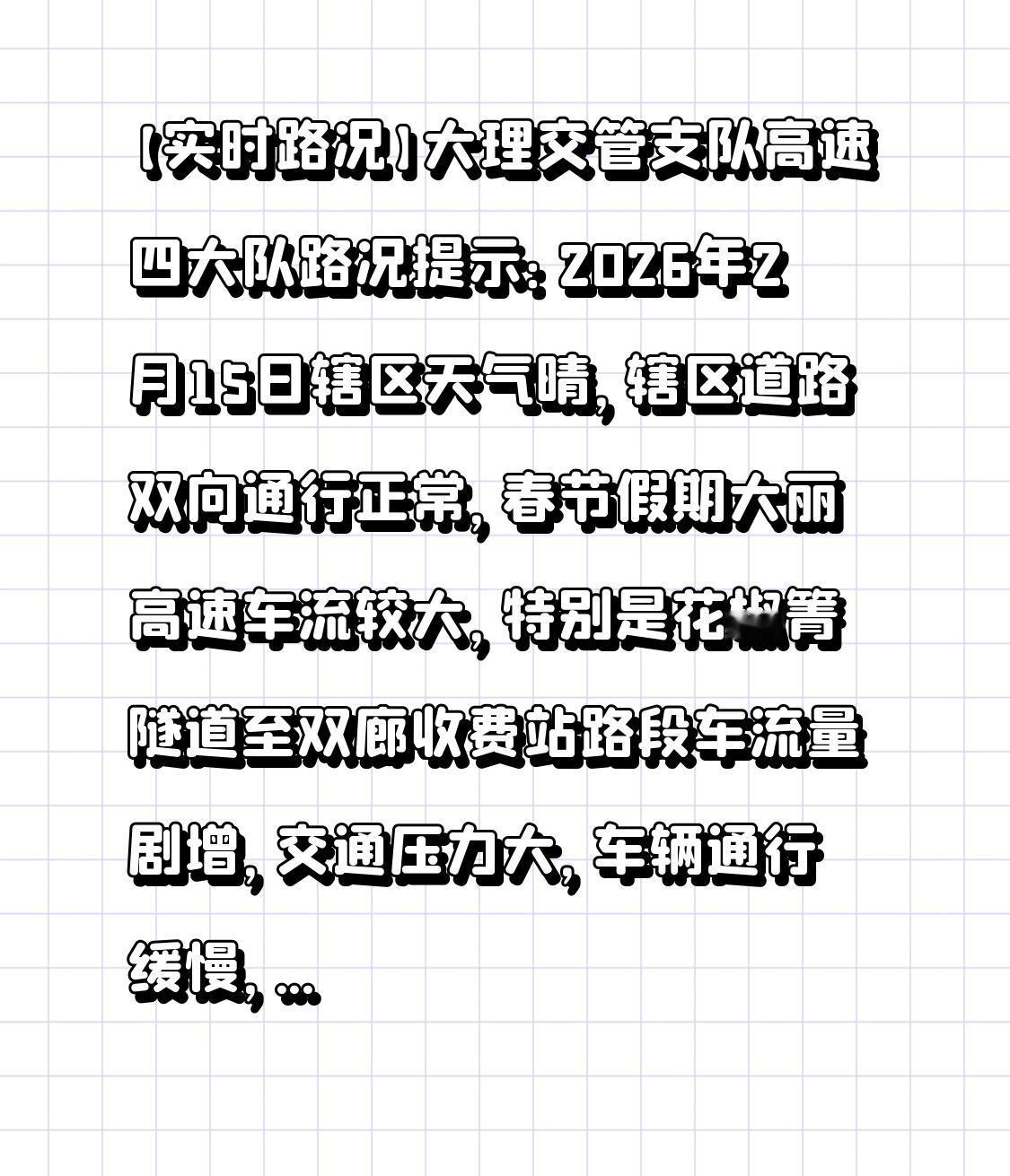 【实时路况】大理交管支队高速四大队路况提示: 2026年2月15日辖区天气晴,辖区道路双向通行正常,春节假期大丽高速车流较大,特别是花椒箐隧道至双廊收费站路段车流量剧增,交通压力大,车辆通行缓慢,易拥堵。 交警提示:春节期间丽江至昆明往返车辆,行驶丽上高速——宾鹤高速——宾南高速——新楚大高速路线较为快捷便利,宾鹤高速路段加油站与服务区还未正式投入使用,驾车出行时请注意提前备好充足油料和电量,提前规划好出行路线,大理高速公路四大队祝您一路平安!大理路况 云南高速路况 大理高速公路 云南交通路况
