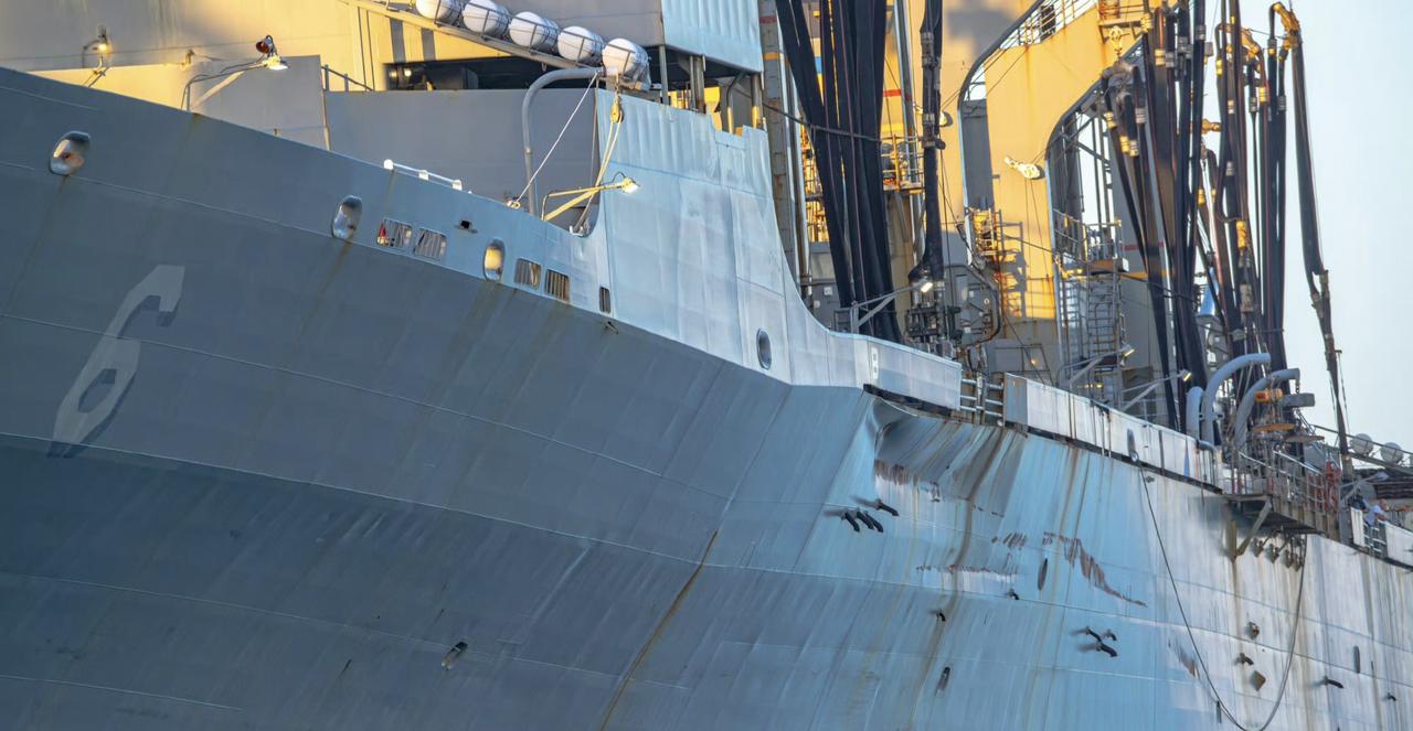 美军补给舰在加勒比海被撞后的样子。