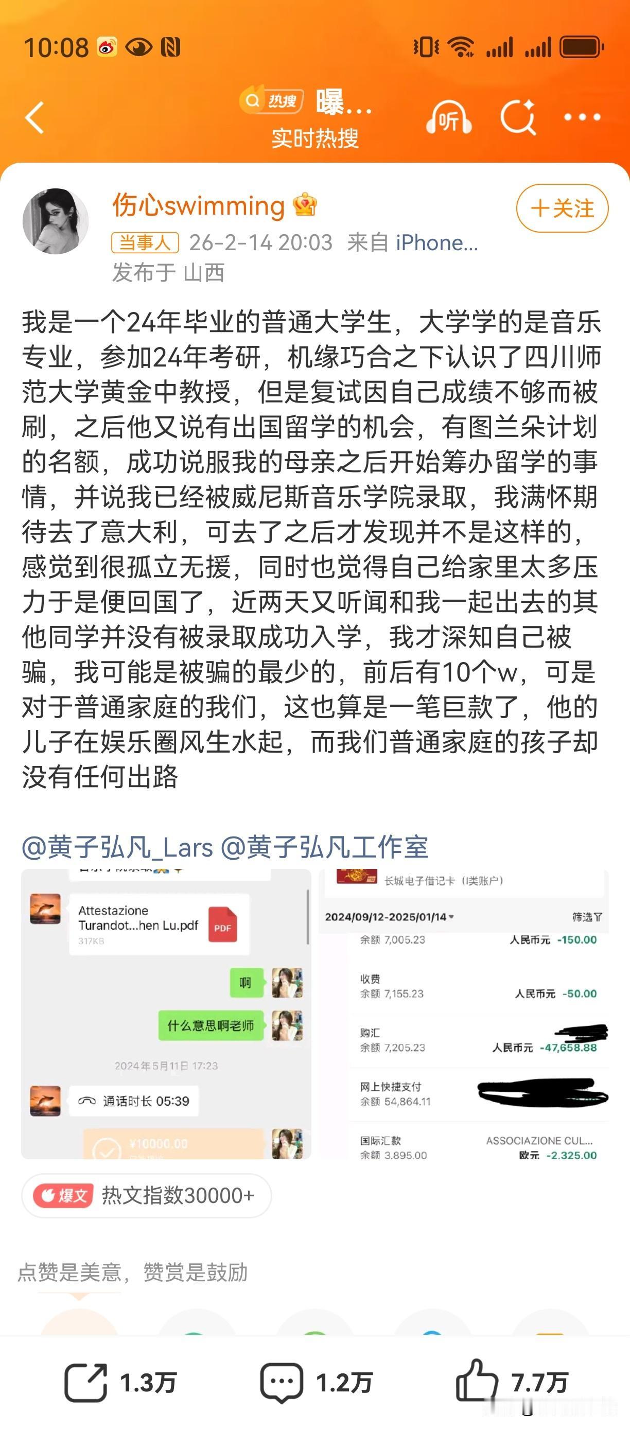 黄子弘凡已经给出回应了,没在怕的!真没想到新年的瓜吃到了黄子弘凡头上!说是黄子弘凡的父亲黄金中,承诺让给学生办理留学,拿了钱最后学生没有被录取,没书可读。 但这里有个巨大的漏洞,留学要申请留学签,没有录取通知书,怎么办理的留学签证呢? 正常的留学流程,要先确定去哪个国家,多少预算,然后要准备语言考试。接着准备材料,申请学校,还要办理护照,签证等手续。 有人分析没有录取通知书,办不了留学签,这几个人既然都去到了留学国家,那肯定是办好了签证的,那肯定是已被录取的。唯一的可能就是语言考试没有通过,所以去到留学国家后要再花钱读语言,这才产生了他所控诉的“去了之后发现不是那样,感到孤立无援,选择回国”。 黄子弘凡回应已经完成证据收集。静待结果吧!