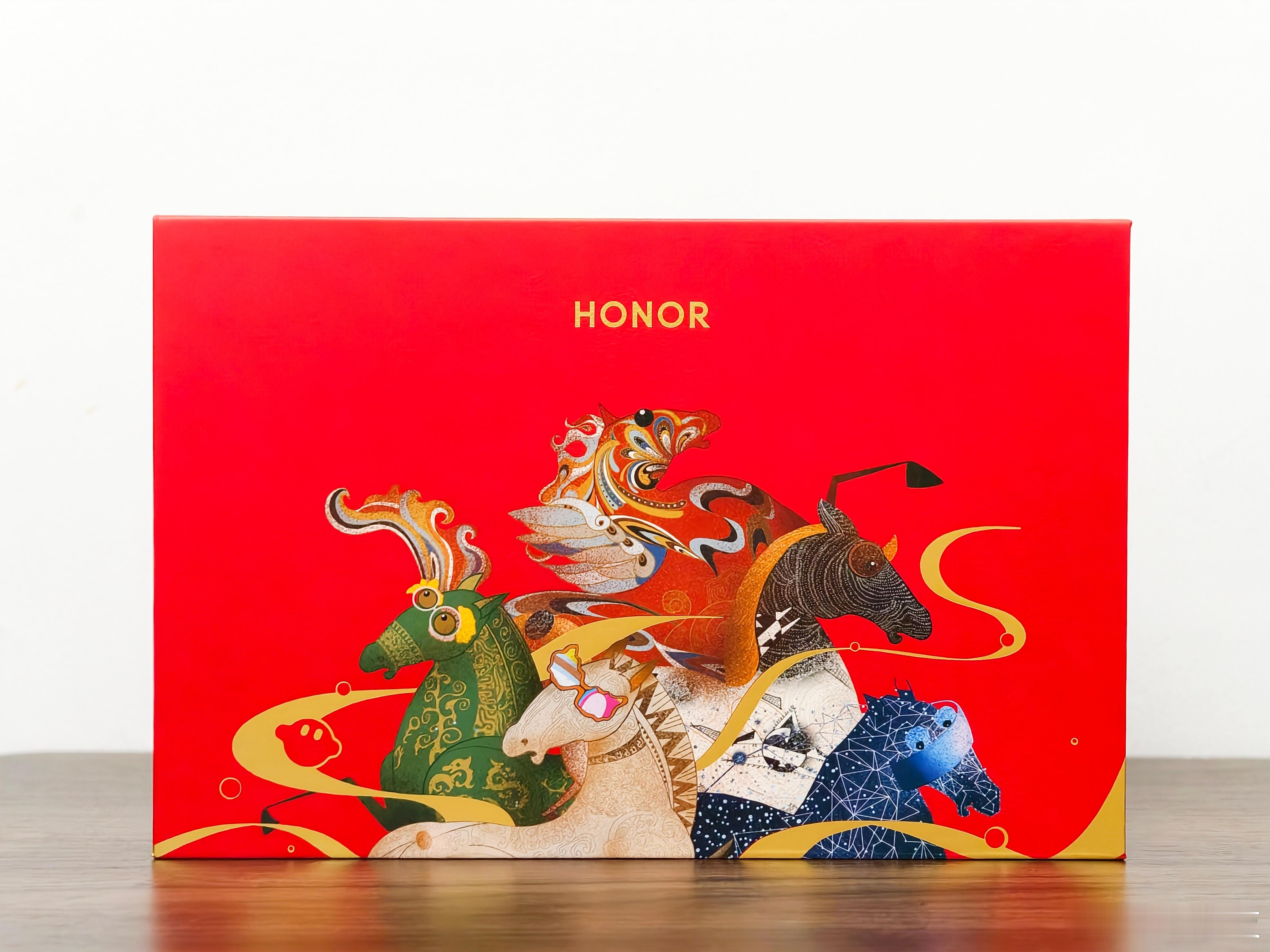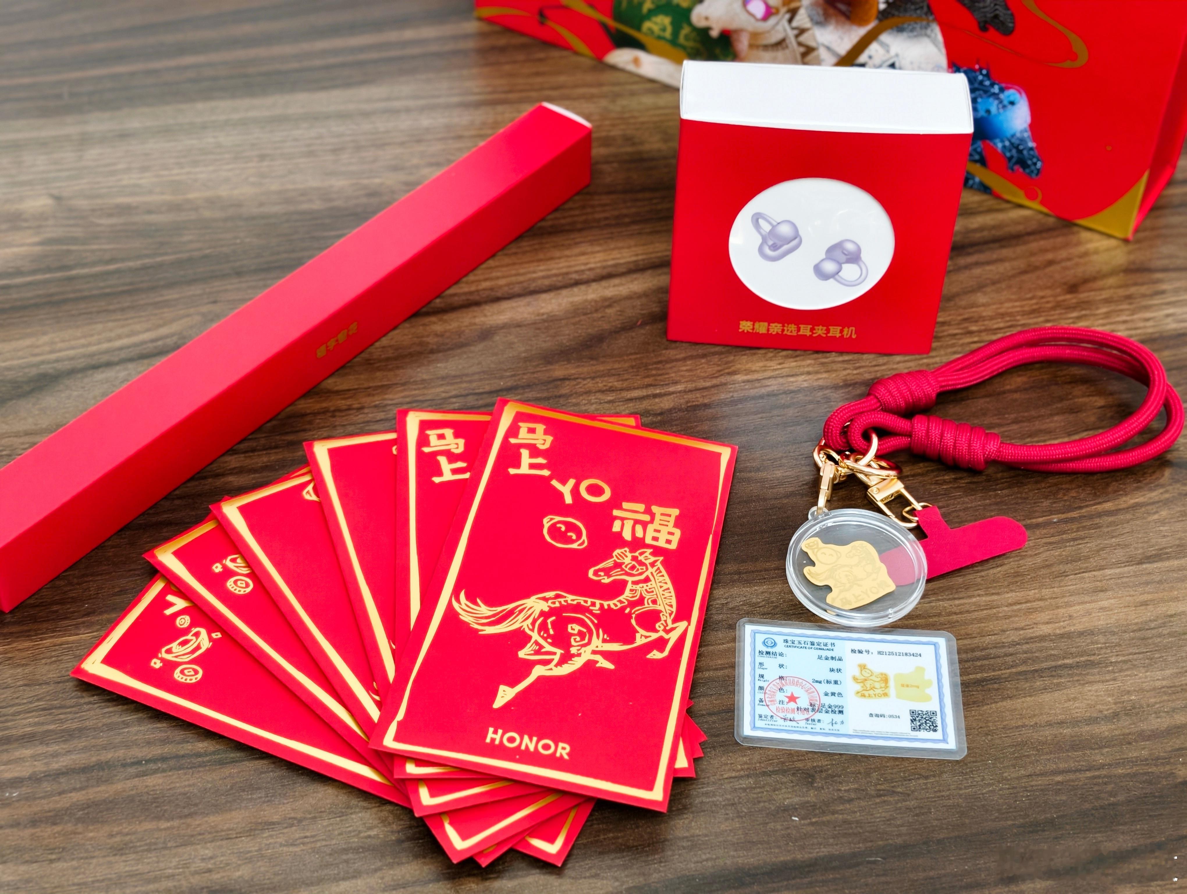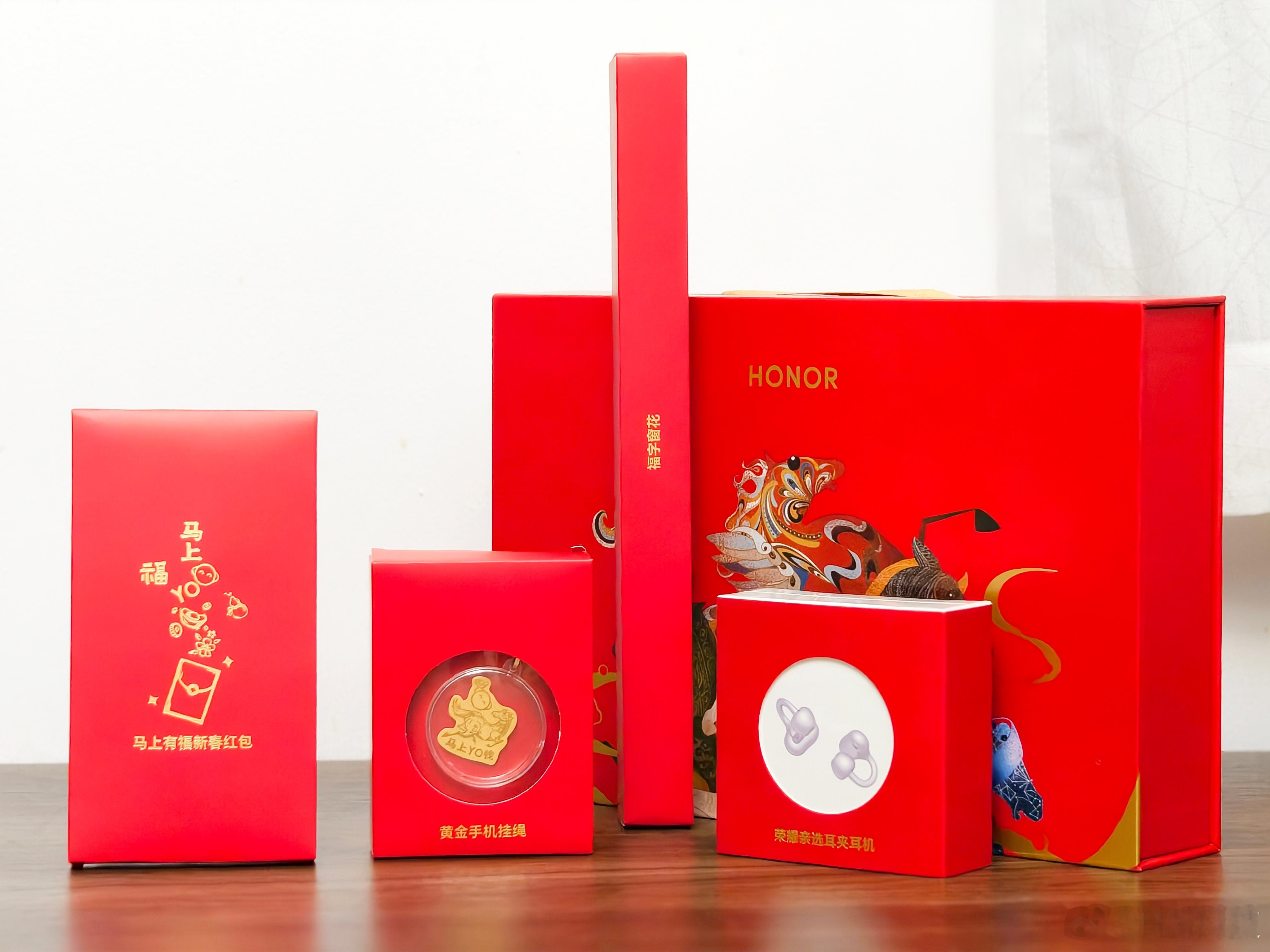 荣耀的年货礼盒有点丰盛啊耳夹耳机一副、手机金贴一枚,还有人见人爱的新春红包和大福