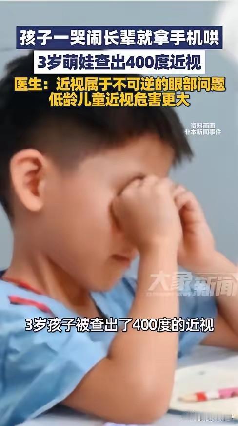 “悲剧还是发生了!”近日,河南郑州,一家长在哄3岁孩子时,发现孩子只要玩手机就会安静,不哭不闹,这让孩子对手机产生了严重依赖。这天家长发现孩子总是揉眼睛,前往医院检查后竟发现近视400度!家长又心疼又后悔。网友:这下把孩子坑惨了! 孩子平时由爷爷奶奶照看,老两口心疼孙子,又怕孩子哭闹打扰邻居,每次孩子一闹,就把手机塞到他手里。动画片、儿歌、短视频轮番播放,孩子一玩就是一两个小时,有时候甚至抱着手机睡着。家长下班回家,看到孩子安安静静的,还觉得老人带娃省心,压根没意识到问题的严重性。 直到那天,孩子揉眼睛的频率越来越高,看东西时总不自觉地眯着眼,凑近了才能看清绘本上的图案。家长心里咯噔一下,赶紧带孩子去了郑大一附院眼科。检查结果出来的那一刻,夫妻俩腿都软了——3岁的孩子,近视度数高达400度。医生说,低龄儿童近视大多是不可逆的,后续度数还可能快速增长,甚至引发弱视、斜视等问题。 爷爷奶奶得知消息后,坐在医院走廊里抹眼泪,说自己是“好心办了坏事”。孩子妈妈抱着孩子,眼泪止不住地掉,她后悔自己平时只顾着上班,把带娃的事全推给老人,更后悔没有早点重视孩子的用眼问题。 这件事在网上炸开了锅。不少网友留言说,自己家也有同款情况,老人带娃图省事,手机成了“电子保姆”。有人算了一笔账,每天让孩子多玩一小时手机,一年下来,近视风险会增加三成。还有人反思,现在的育儿环境太浮躁,我们总想着用最快的方式让孩子安静,却忘了这种“省事”背后,是孩子一生的健康代价。 医生提醒,3岁到6岁是孩子视力发育的关键期,这个阶段的眼球还在发育,长时间近距离用眼,会让眼球壁过度拉伸,导致近视不可逆。比起给孩子买昂贵的护眼产品,不如多花点时间陪孩子做游戏、读绘本,带孩子去户外晒太阳。 现在,这对家长已经把家里的电子产品都收了起来,每天下班后都会带孩子去公园散步,周末更是泡在户外。他们说,就算再忙,也不能再用手机“哄”孩子了。 各位读者你们怎么看?欢迎在评论区讨论。 信息来源:《1月29日河南郑州,一哭闹长辈就拿手机哄,3岁萌娃查出400度近视!医生:近视属于不可逆的眼部问题,低龄儿童近视危害更大