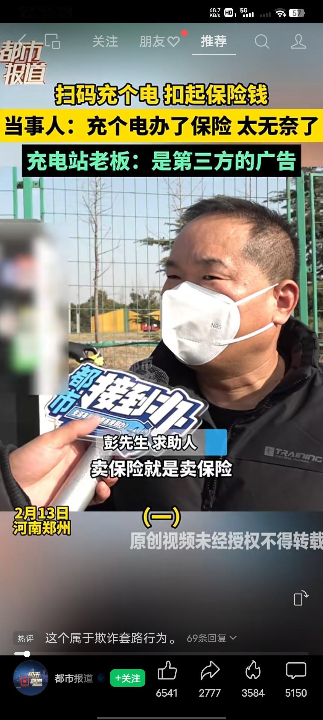扫码充个电,却稀里糊涂生成了保单! 求助人彭先生:当时我就扫个码充电,扫了码之后出现了一个页面,然后点进去之后就会显示让你输入手机号。我感觉他不应该这样做,你卖保险就是卖保险,你充电就是充电,你这样弄个充电桩充电之后却买成保险了,像我们这样的出租车司机很无奈的,我12月28号来充的电,结果回到家之后就生成了保单了,八点之后保单就已经生成了,我一天啥也没干,也没有操作,这个保险我买的稀里糊涂。 充电站老板:这个红色的二维码,是属于我们合作的第三方,它那个小程序扫进去之后呢,可能有一些广告。 水滴保官方工作人员:你有可能就是因为扫了充电码,它会弹出一些广告之类的,应该是不小心点到了,这样保单就生成了。 现在手机上的一些保险广告之类的很讨厌,你一不小心就会生成保单,我老公也是在刷快手的时候也不知道是怎么生成了一个保单,在看到银行的扣款信息之后才知道有这样一个保单,可是也不知道是怎么生成的,这个保单老公也说没有操作,只是在快手刷视频。 有网友说这就是欺诈,这跟抢劫有区别吗?有关部门应该出台法律,禁止平台串联广告,这样串联广告和流氓二维码如不是本人出于本意生成的保单,给别人造成经济损失造成困扰的,平台应该承担责任才行!