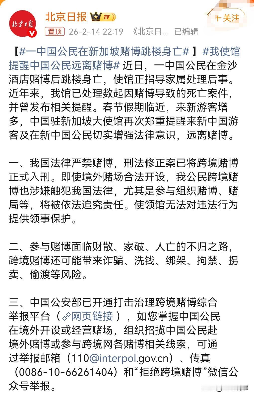 这真的是太悲剧了,千万不要赌博,赌博是能够导致家破人亡的。 近日,一中国公民在新加坡赌博跳楼身亡。 如果不去赌博的话,那肯定是不会发生这种悲剧的。 10赌9输,赢的永远是庄家。 多少人因为赌博弄得倾家荡产,严重的甚至轻生了断。 生活中赌博现象实在是太多了。