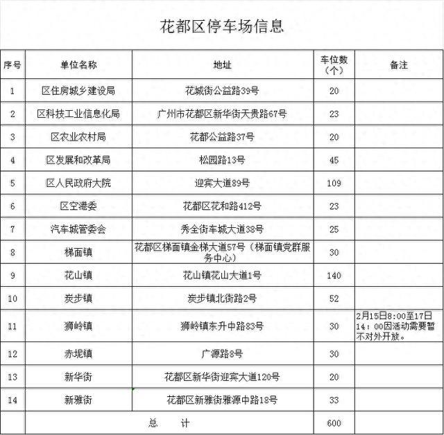 区人民政府大院、区发展和改革局、新华街道办事处、花山镇人民政府等14家单位共计600个泊位,具体开放点位信息可通过“花都智慧停车”微信小程序实时查询。