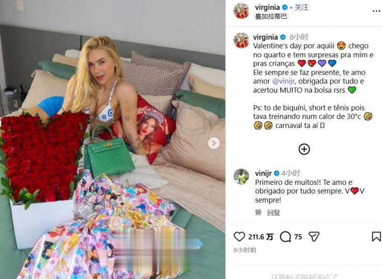 弗吉尼亚:情人节在这儿过,回到房间,发现为我和孩子们准备的惊喜,你总是时刻陪伴,爱你,亲爱的维尼修斯,谢谢你所做的一切,包包选得太准了哈哈。穿比基尼、短裤加运动鞋是因为我正在30℃的高温下训练,狂欢节就要到了。