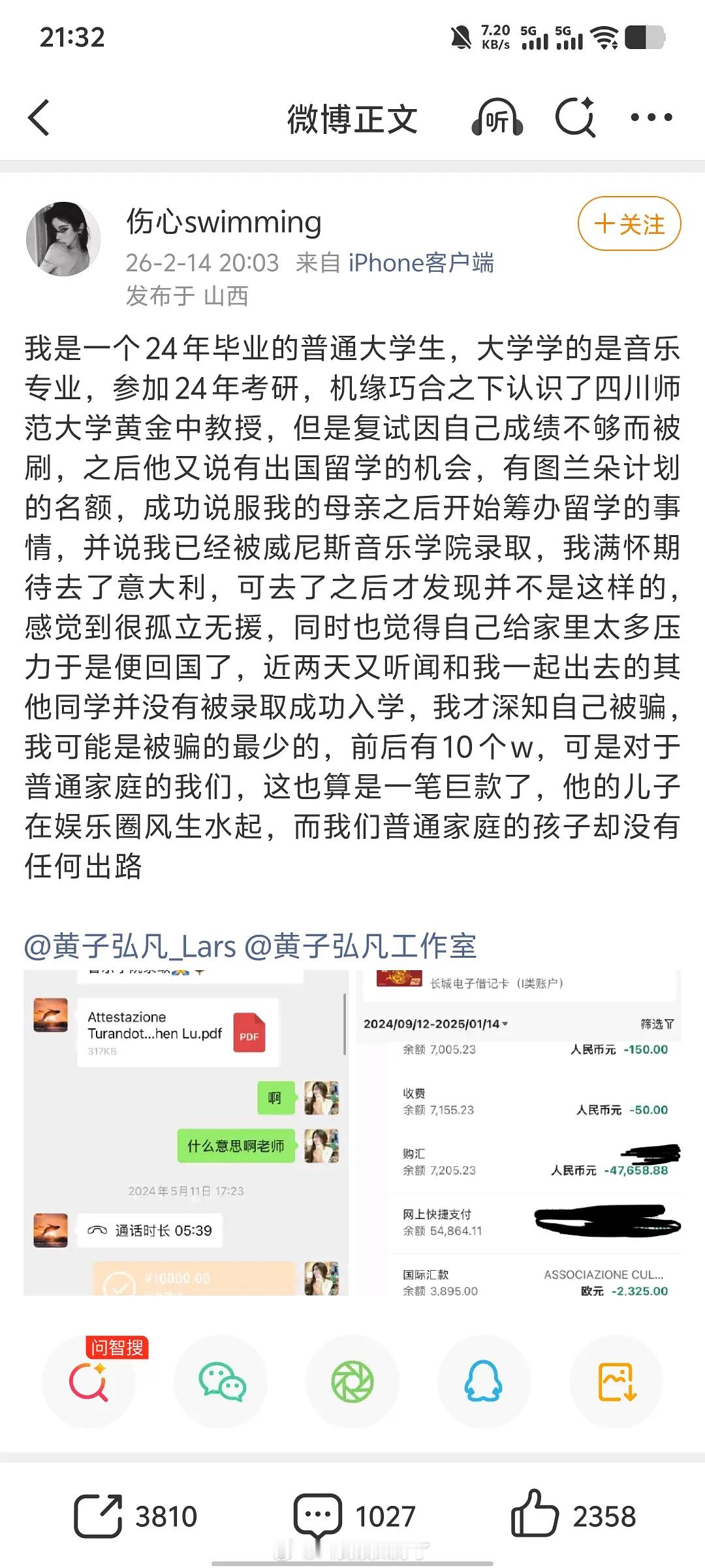 有网友爆料黄子弘凡爸爸诈骗学生,对方没有被成功录取结果还是被他游说去留学。
