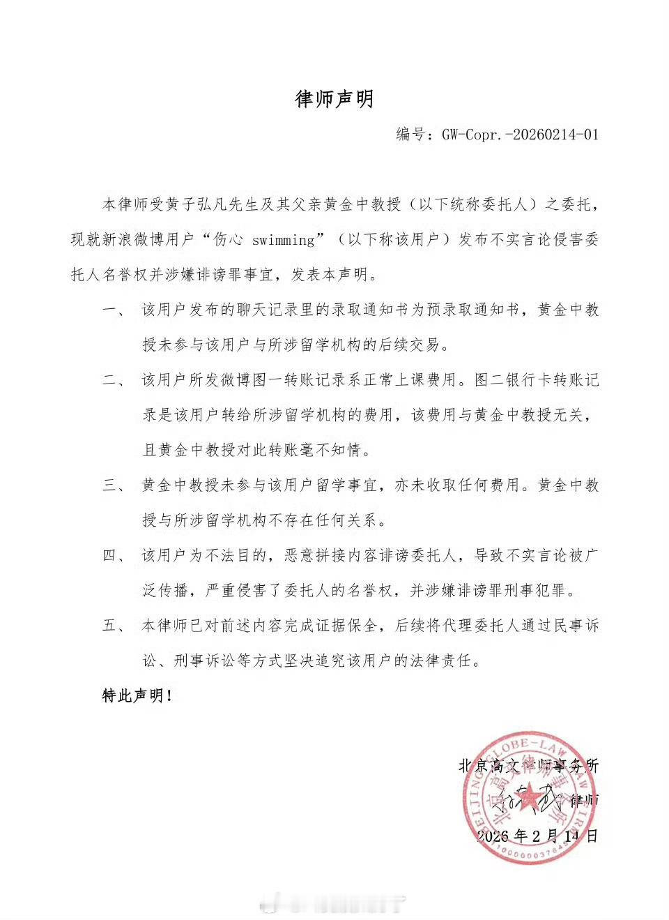 对此黄子弘凡和爸爸委托律师发了声明不实言论,涉嫌诽谤。