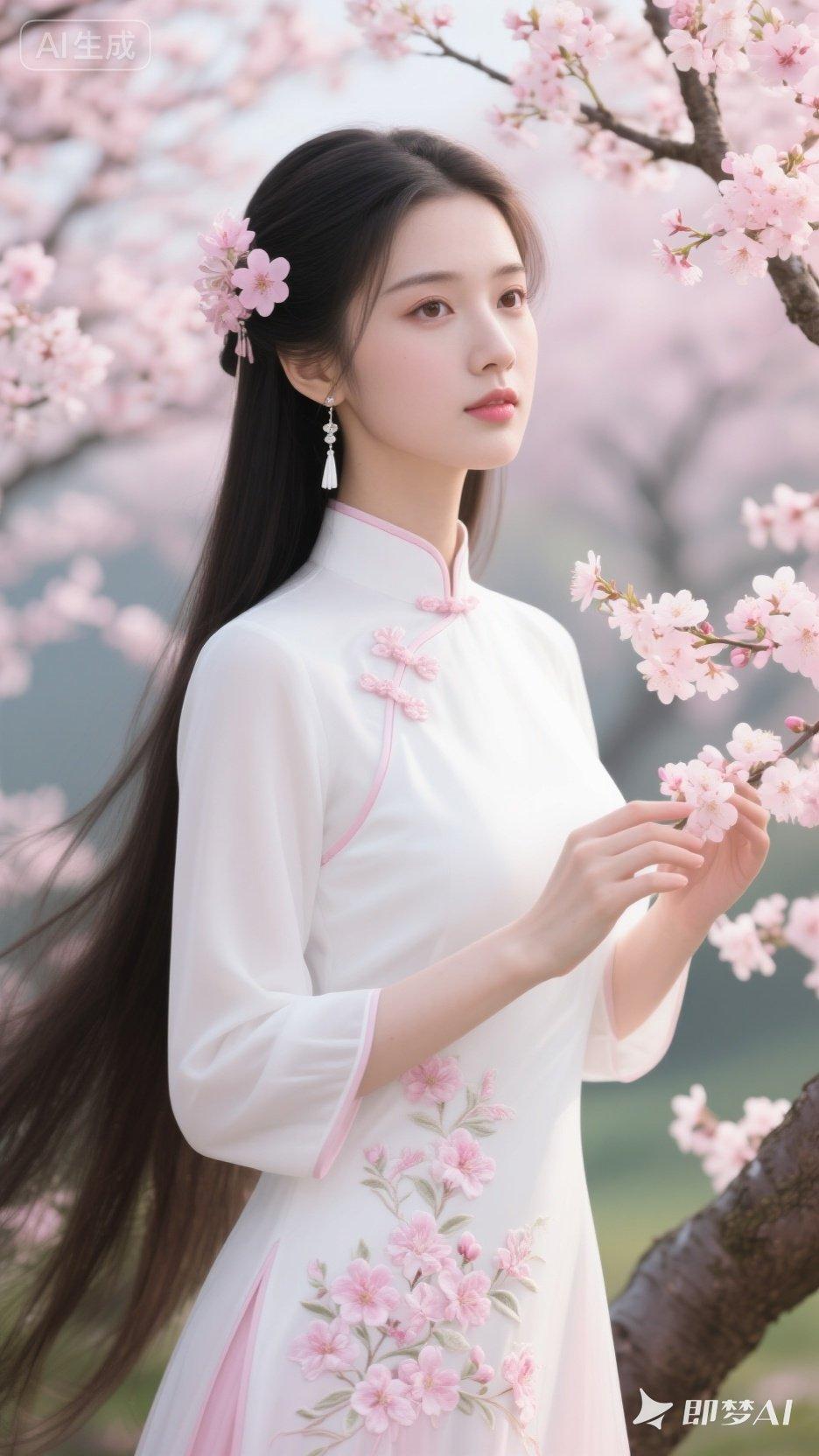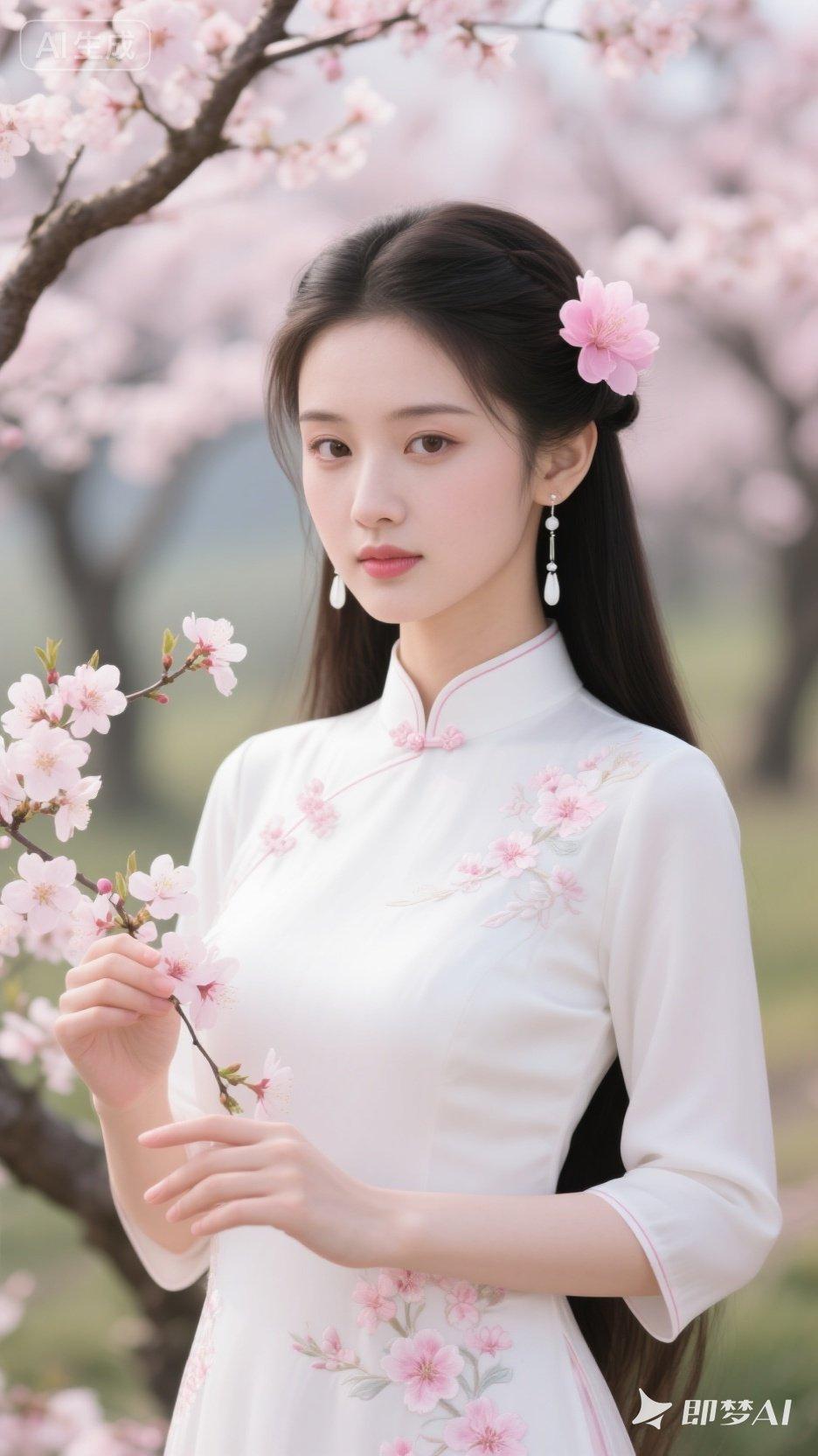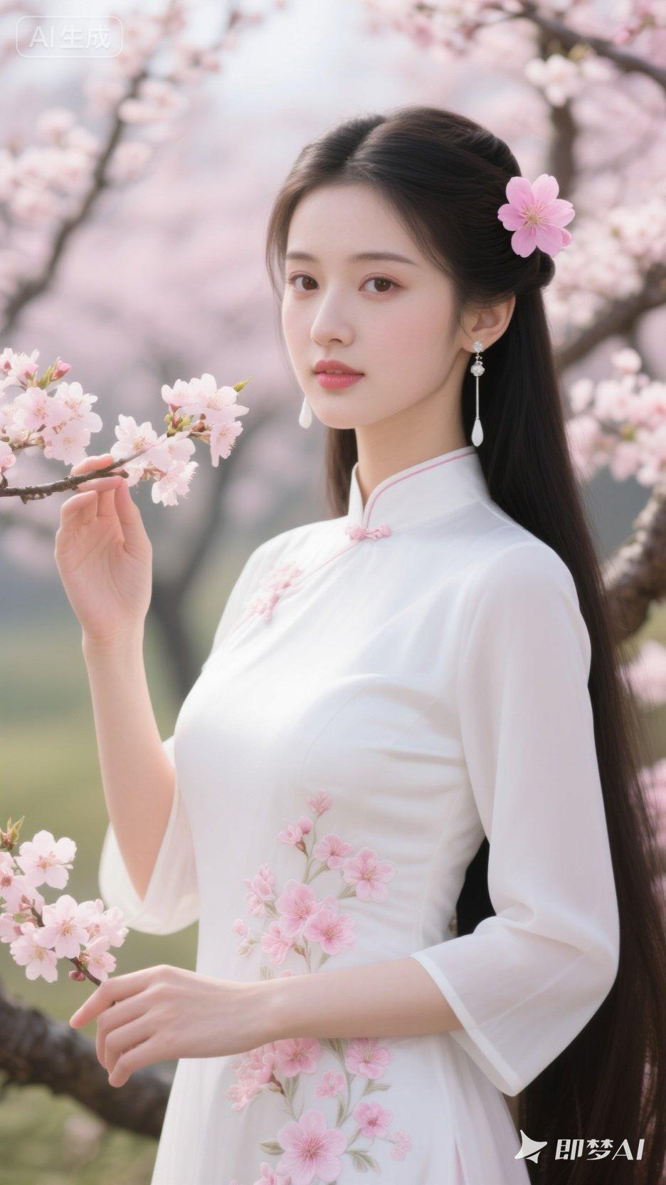 优雅白裙女子树上摘巨枣,尽显自然之美。旗袍旗袍美女