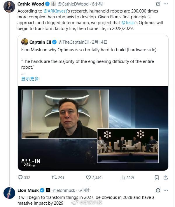 马斯克对此回应称:"它将在2027年开始颠覆现状,到2028年影响将显而易见,而到2029年将产生巨大的影响。"
